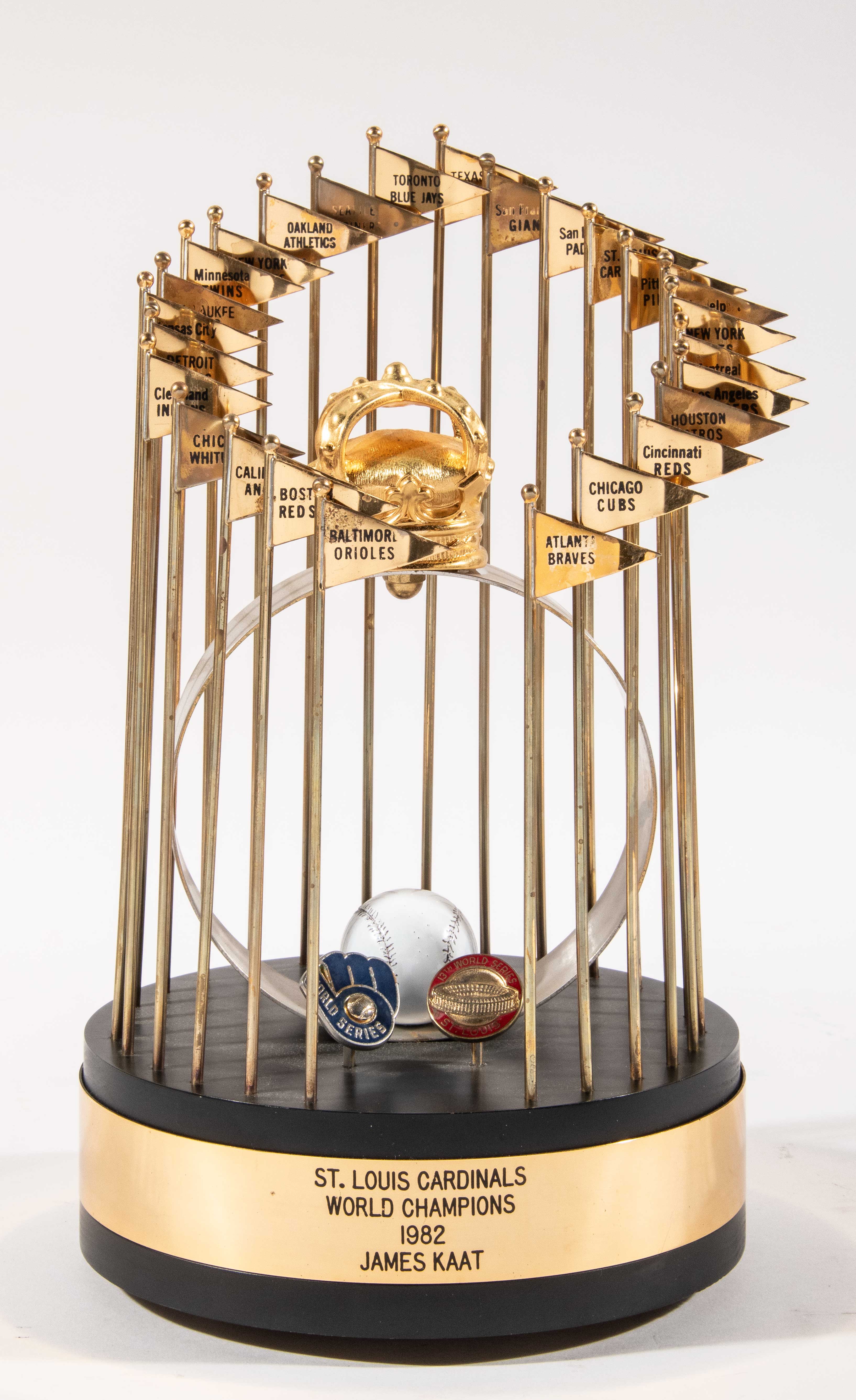 Description:1982 Jim Kaat St. Louis Cardinals World Series trophy. Figural trophy as presented to Kaat for his efforts as a member of the World Series Champion Cardinals team. High quality figural piece stands 11" tall with brass team name pennants encircling an upright circle which supports a crown finial. Cardinals and Brewers enameled World Series press pin facades adorn the base. A brass band wrapped around it reads "St. Louis Cardinals World Champions 1982 James Kaat" in block lettering. Original "Balfour" label is on the underside. Scattered wear includes some minor tarnish, very small amounts of loss to the team names on pennant, and it appears that the upright circular support was polished resulting in the removal of 99% of the brass colored finish. In addition the small baseball which sits on the base has either been replaced or the original was painted over in white. A highly desirable symbol of the Cardinals Championship and further enhanced with the lineage to a Hall of Fame player. Includes signed letter of provenance from Jim Kaat: EX-EX/MT with note to description