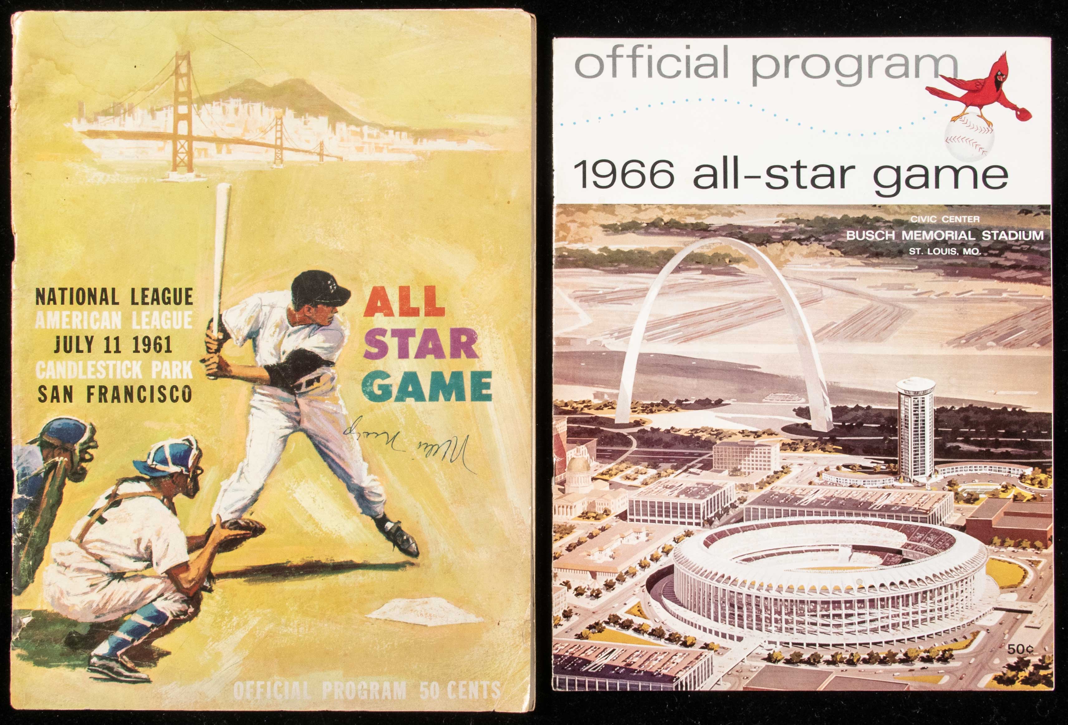 Description:1961 and 1966 MLB All-Star Game programs from the Willie Mays Collection with 1961 autographed by Mays. Original program issued for the 1961 All-Star Game played st San Francisco signed by Mays across the front in blue ink rating 8 out of 10. Small hole punch at top left of back and interior is unscored. 1969 program issued for the 1966 All-Star Game played in St. Louis remains unscored inside and shows light to moderate use. Includes auction LOA from JSA (signature) and certificate of provenance from the Willie Mays Collection: Range GD-EX