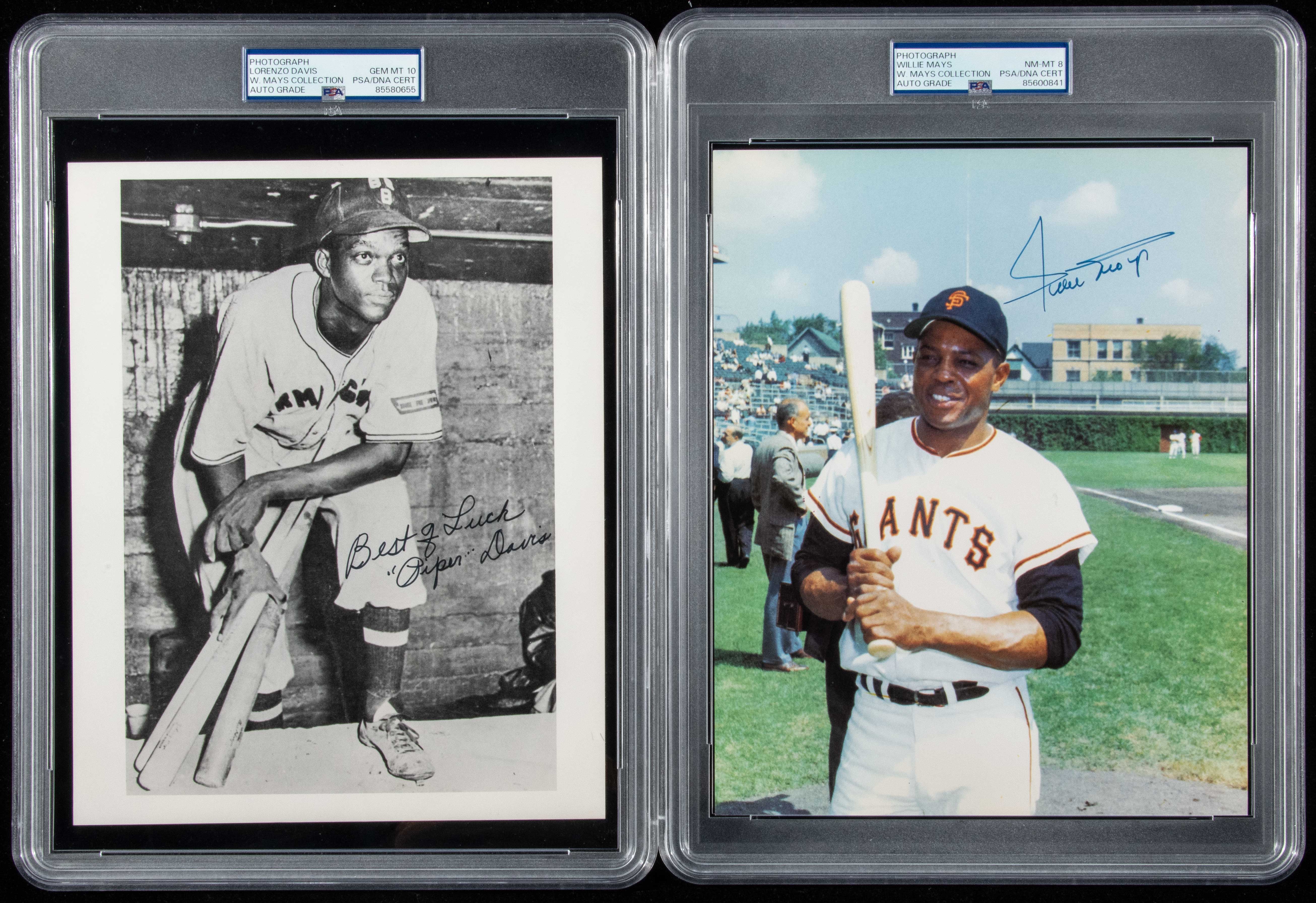 Description:Piper Davis and Willie Mays autographed photographs (PSA/DNA 10 GEM MINT and 8 NM-MT). Notable signed black and white image from Birmingham Barons player and Mays' mentor Piper Davis signed "Best of Luck, Piper Davis" in black marker. Signature is very bold rating 10 out of 10 from the player who helped form a young Willie Mays into the legendary player he became through the Minor League in Birmingham, AL. The lot includes color 8"x10" photo signed by Mays in blue sharpie rating 8 out of 10. Encapsulated by PSA/DNA (10 GEM MINT and 8 NM-MT) with special "W.Mays Collection" pedigree labeling: Range NM/MT-GEM MINT