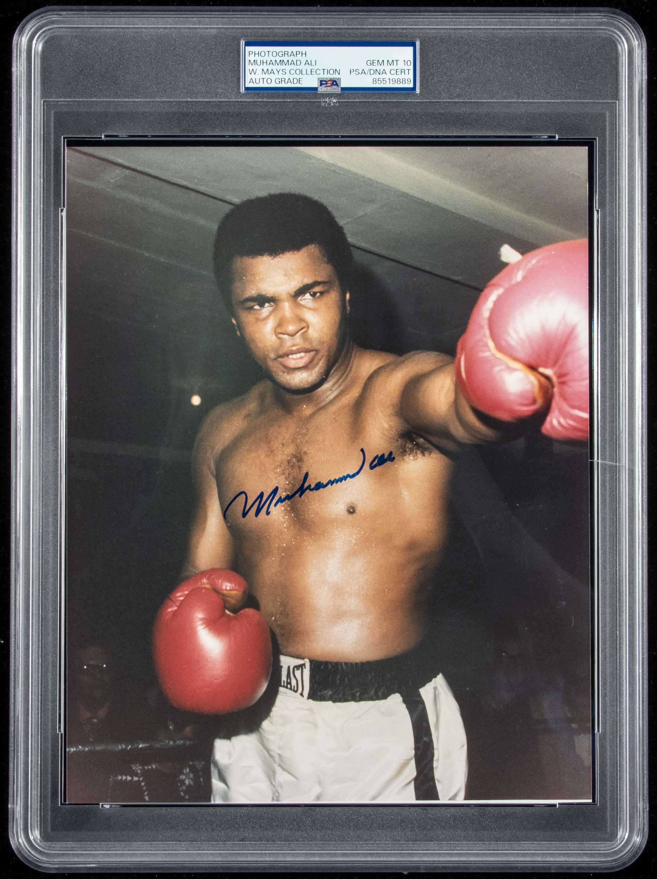 Description:Muhammad Ali autographed photograph from the Willie Mays Collection (PSA/DNA 10 GEM MINT). Color 8"x10" photo picturing in boxing pose signed across the front in blue sharpie. The autograph is beautifully signed and has been assigned a perfect grade of 10 out of 10 by PSA/DNA. Encapsulated by PSA/DNA (10 GEM MINT) with special "W.Mays Collection" pedigree labeling: GEM MINT