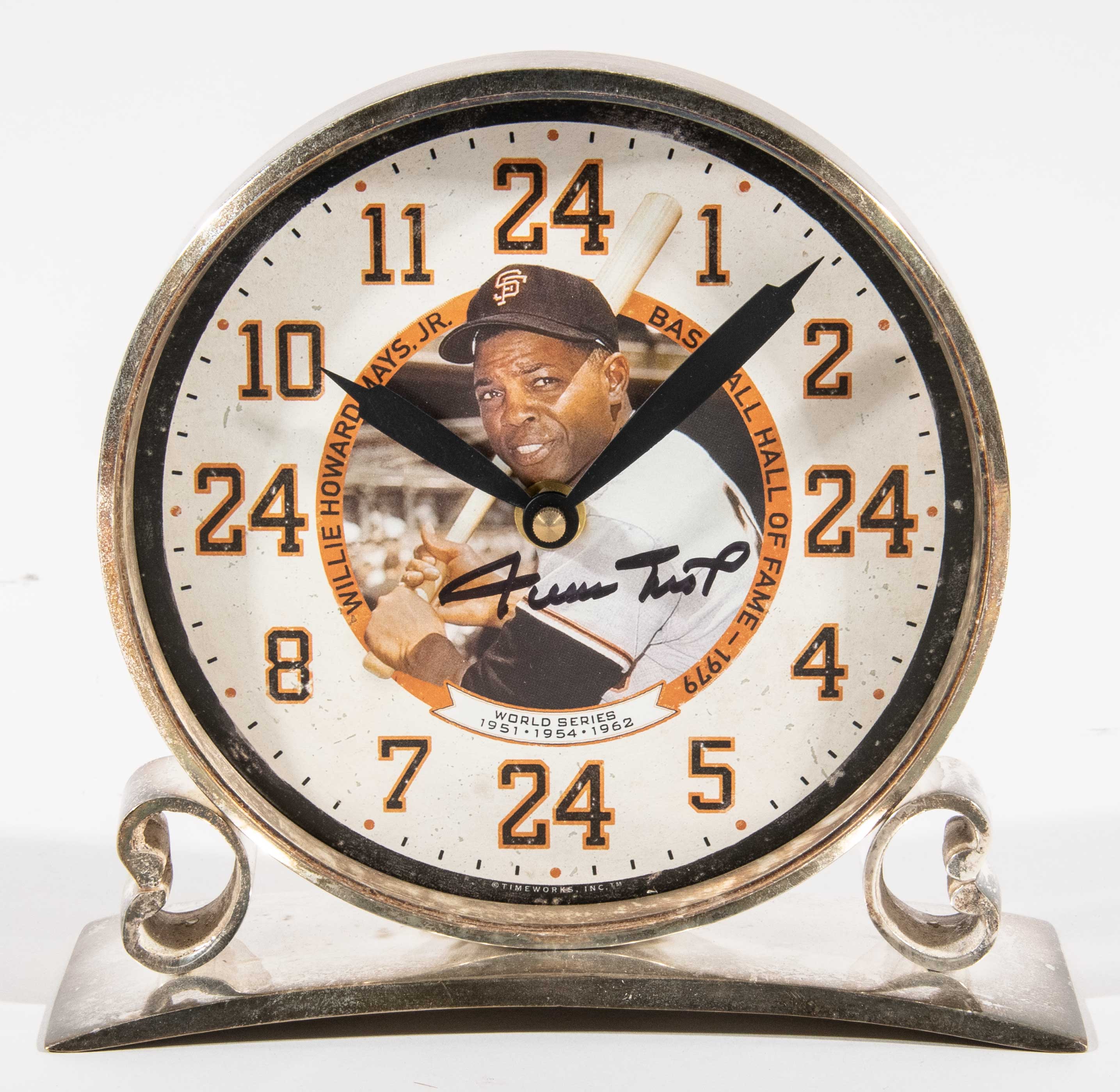 Description:Willie Mays autographed commemorative clock. Limited edition desk clock depicting Willie Mays in color pose. The clock façade is signed by Mays in black sharpie rating 9 out of 10. 7" tall with its original box marked Timeworks, Inc. Willie Mays 24 Authentication label affixed and includes certificate of provenance from the Willie Mays Collection: NM