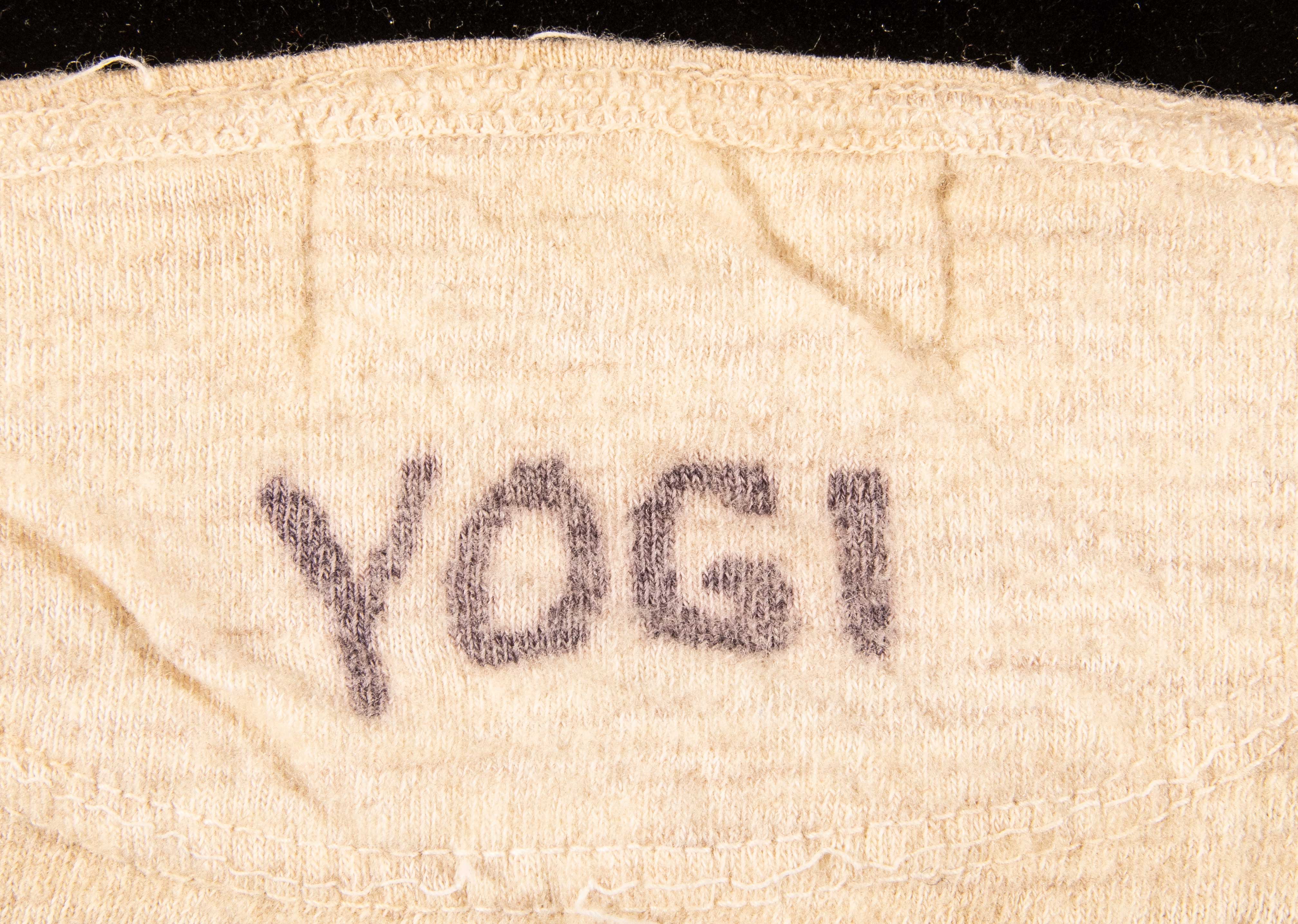 Description:Yogi Berra New York Mets professional model baseball undershirt c.1970s. Cream color wool undershirt having royal blue sleeves retains its original Tim McAuliffe manufacturer's tag inside collared area. Back of the collar area displays "Yogi" in period black marker indicative of use by the Mets manager Yogi Berra under which Willie Mays played for his final few MLB seasons. Evident moderate use throughout. Includes LOA from Hunt Auctions and certificate of provenance from the Willie Mays Collection: EX