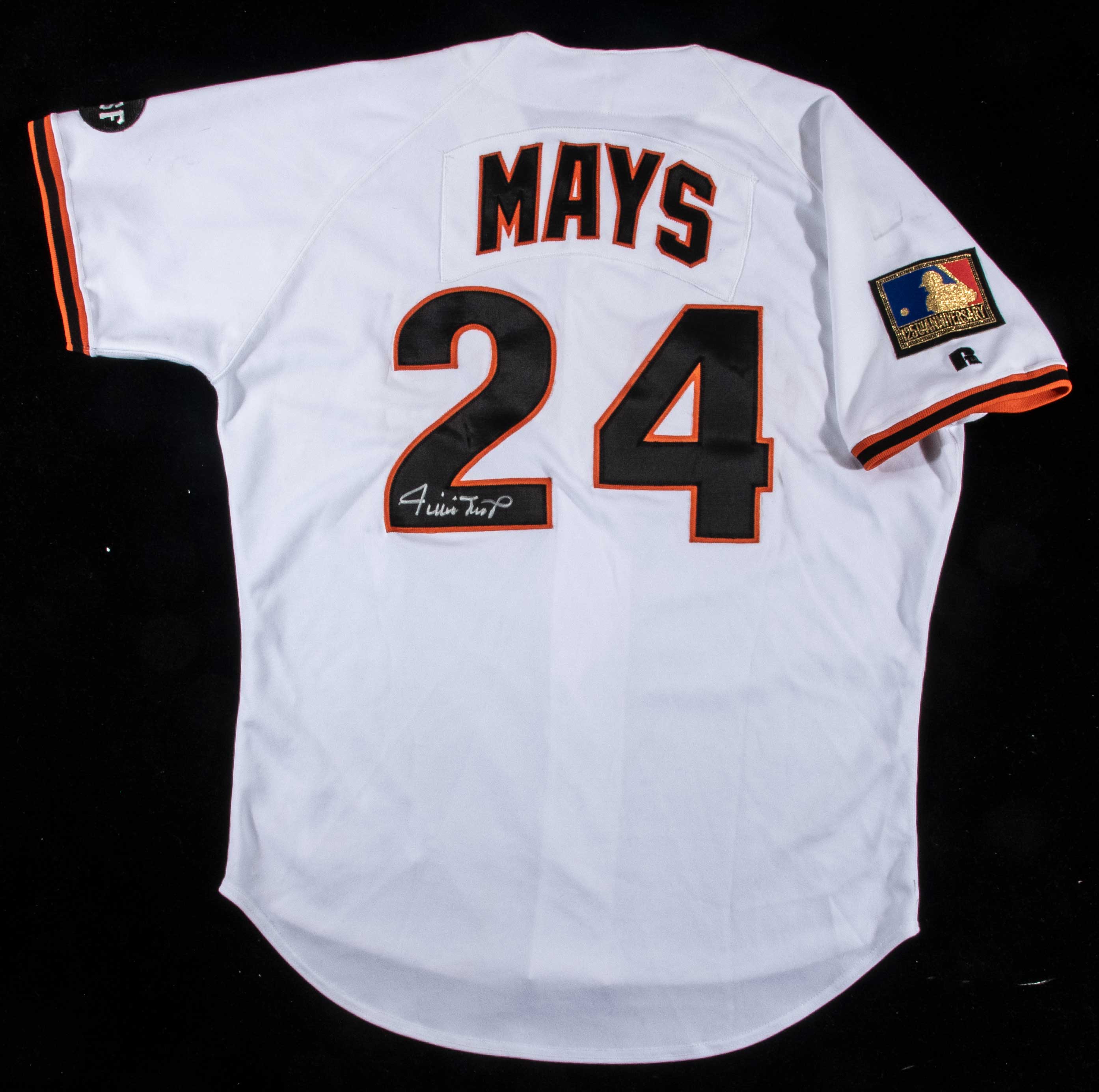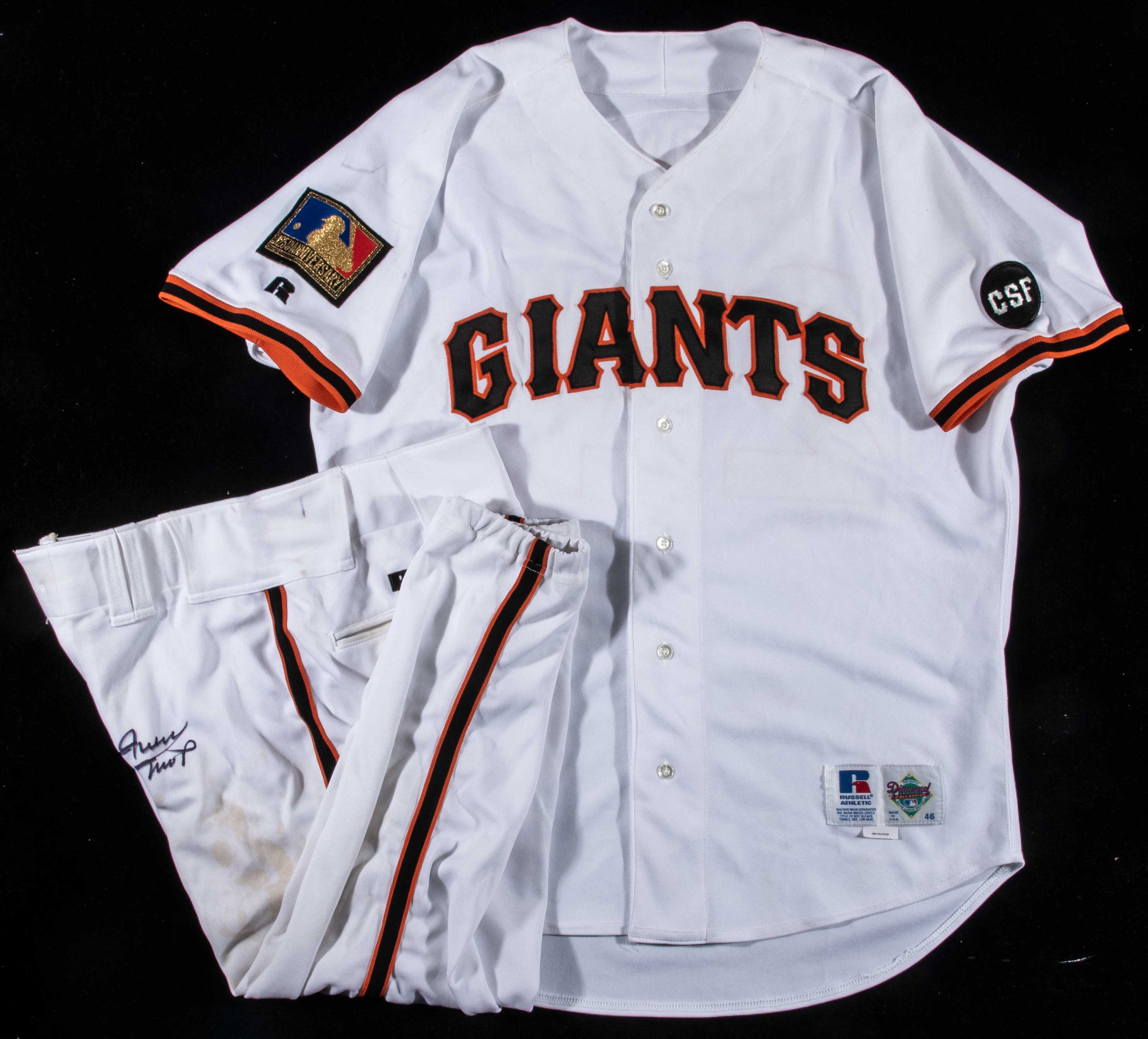 Description:1994 Willie Mays autographed San Francisco Giants professional model home uniform (MLB 125th Anniversary and Chub Feeney Memorial Patches). White knit jersey with "Giants" team name across the front in black on orange tackle twill with matching "Mays" nameplate on the back above "24". Exterior tail retains its original Russell Athletic manufacturer's label with size 46 indicator and "100% Polyester" flag tag. Desirable MLB 125th patch with gold perimeter affixed to the left shoulder with the "CSF" memorial patch on the right shoulder in commemoration of longtime Giants President Chub Feeney's passing. Jersey is signed on the back in silver by Mays. Matching pants are included with Russell Athletic manufacturer's label inside the waistband aside printed supplemental tag "Mays 35-24-94 with "OK" written in black marker. Pants are signed on the front by Mays in black sharpie. Both jersey and pants exhibit moderate use/wear with some soiling to jersey shoulder and back area along with spotting/staining to pants as the uniform was likely issued to Mays for his service in a coaching and advisory role with the team. Desirable Mays game uniform option to the much rarer and costly playing career examples with excellent display qualities. Includes LOA from Hunt Auctions (jersey), Auction LOA from JSA (autographs), and certificate of provenance from the Willie Mays Collection: EX