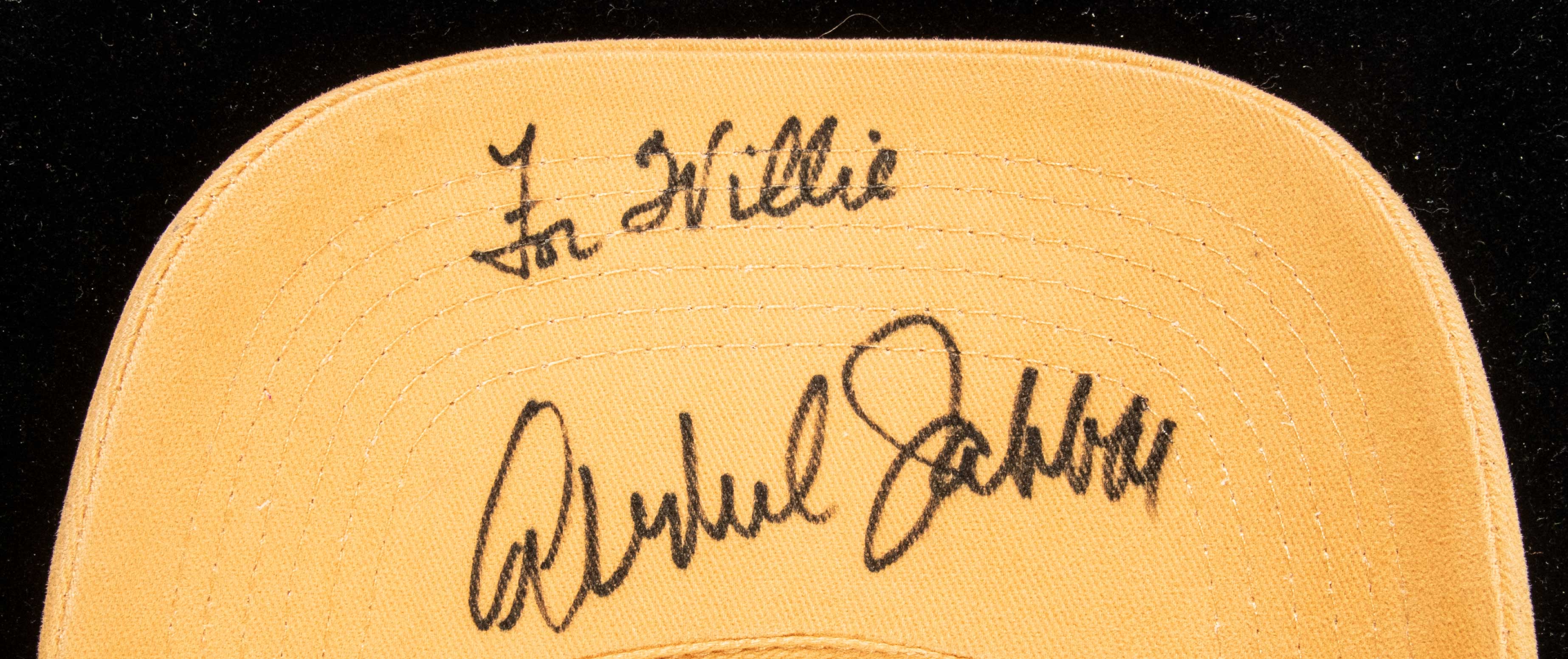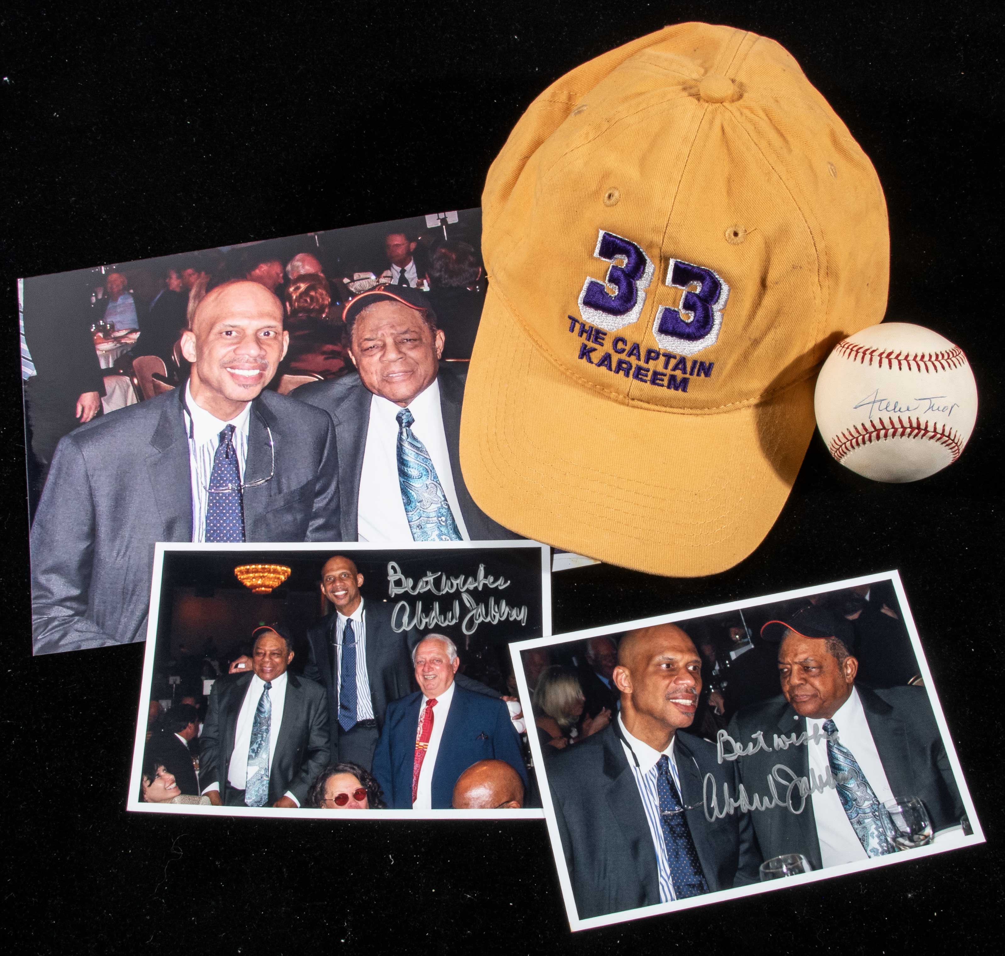 Description:Kareem Abdul Jabbar autographed hat, photographs, and Willie Mays single signed baseball from the Willie Mays Collection. Gold baseball style hat having "33 The Captain Kareem" embroidered in purple across the front. Signed under the bill black sharpie, "To Willie, Abdul Jabbar". The hat shows evident wear and was almost certainly personally worn by Jabbar before gifting to Willie Mays. Two 5"x7" color photos of Mays and Jabbar each signed by Jabbar in silver sharpie are also included. Lot also includes Willie Mays single signed L.Coleman NL baseball. Signature rates 8 out of 10 with the ball having some light toning. Includes auction LOA from JSA and certificate of provenance from the Willie Mays Collection: EX-MT