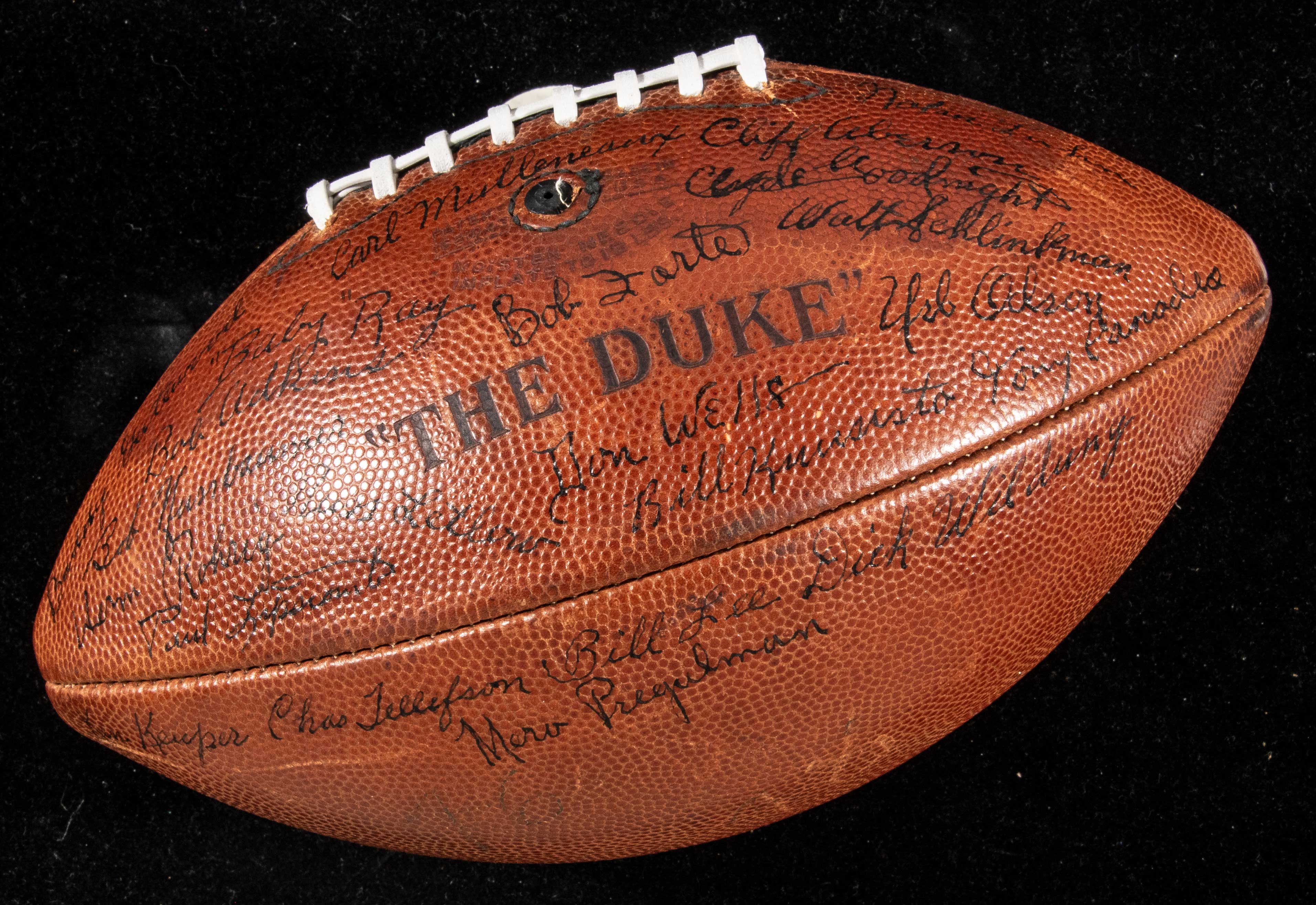 Description:High grade 1946 Green Bay Packers team signed football with Lambeau, Hutson, Canadeo, Smith. Thorp Sporting Goods official NFL Bert Bell football signed by (38) members of the 1946 Packers including Curly Lambeau, Don Hutson, Walt Kiesling, Tony Canadeo, Bruce Smith, Ted Fritsch, Herm Rohrig, Irv Comp, Bob Nussbaumer, Bob Forte, Larry Craig, Walt Schlinkman, Clyde Goodnight, Don Wells, Paul Lipscomb, Bob Flowers, Les Gatewood, Nolan Luhn, Roy McKay, Charlie Brock, Bill Lee, and others. Signatures rate 6/7 to 9 (avg 8) out of 10. Rebladdered with new laces, but minimal wear (does have light "46" rubbed/written on a lower panel, and "47" beside the laces). Includes full LOAs from both JSA and PSA/DNA: EX/MT-NM