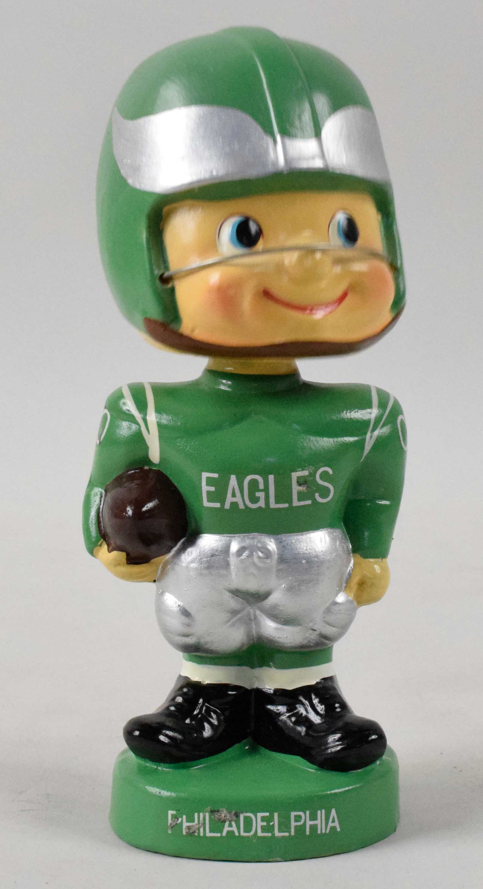 Rare "toes-up" Philadelphia Eagles nodder c.mid 1960s. Horizontal ball variation with green round base presents very nicely with vibrant color, some wear on the base decal, and surface having a few areas of paint touch ups: EX-EX/MT
