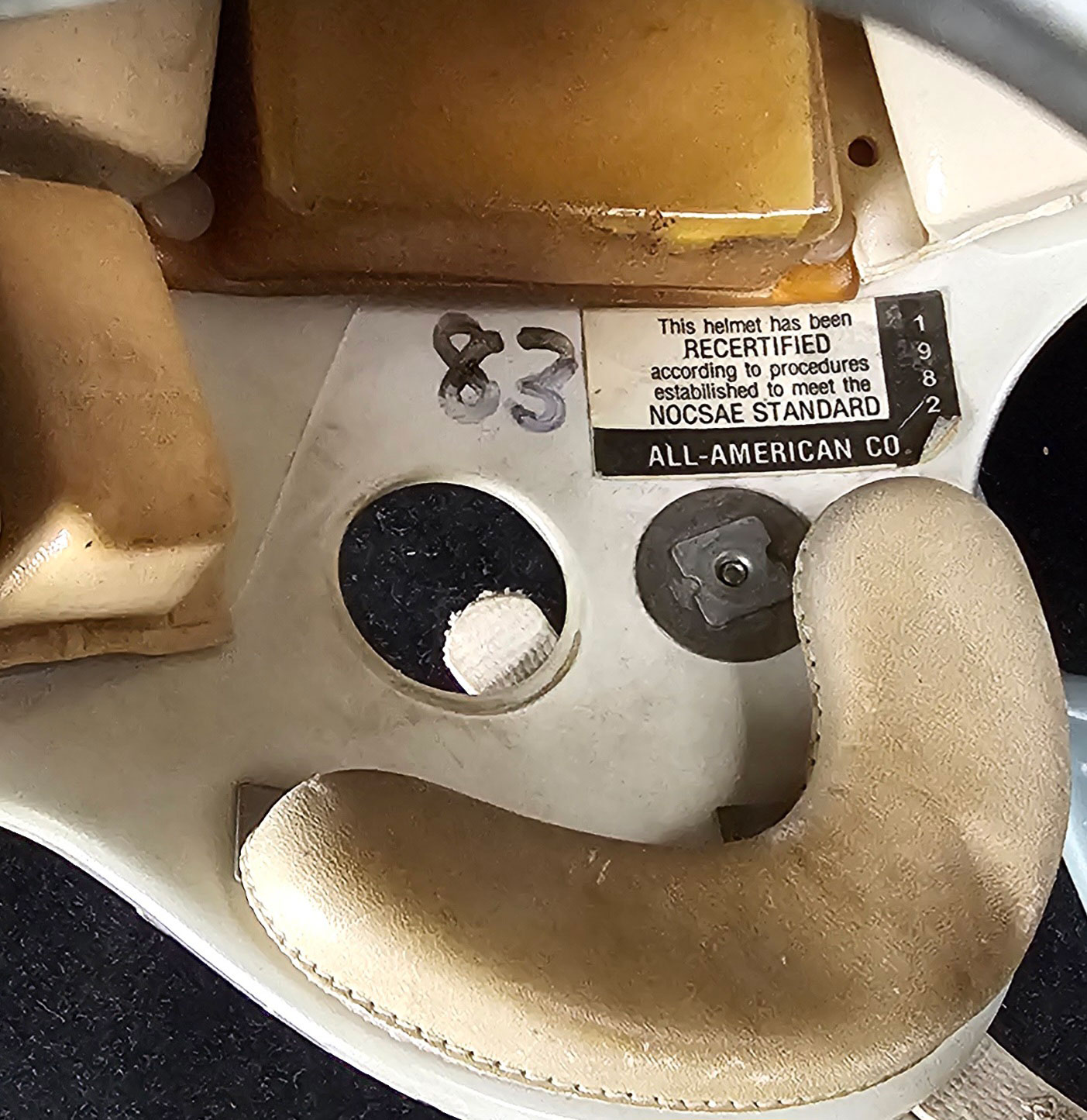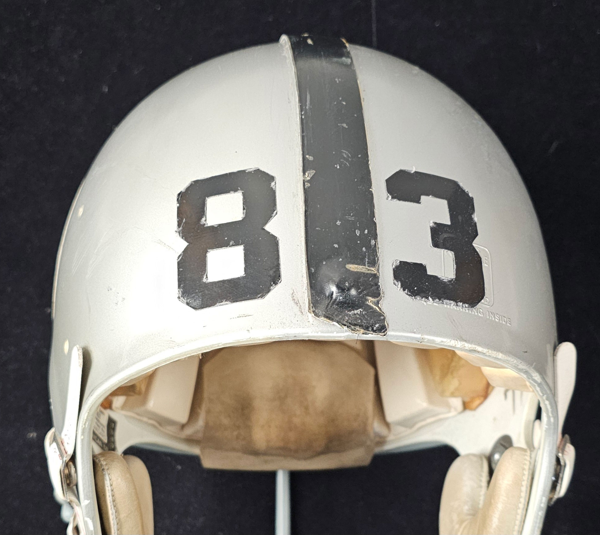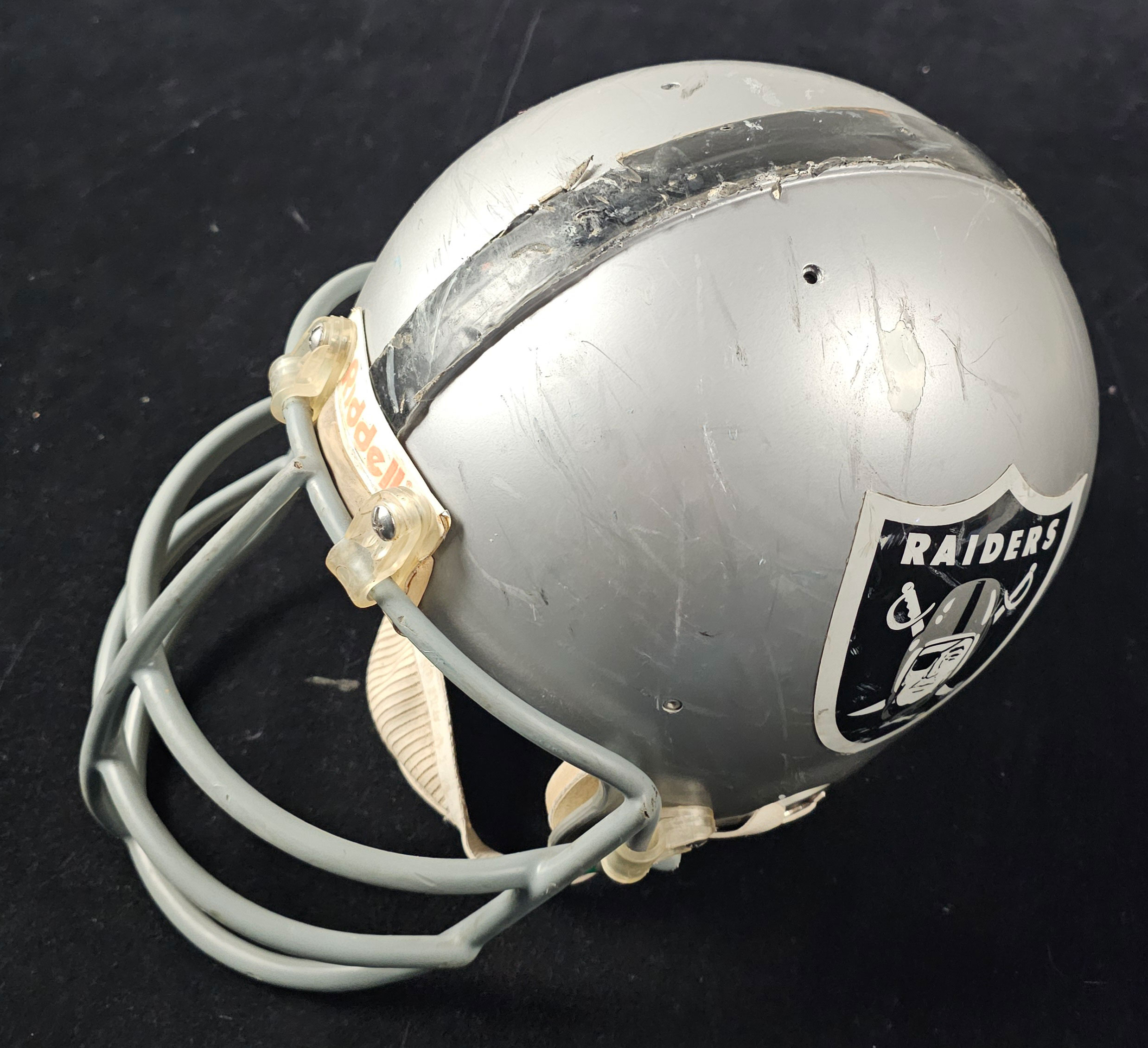 Description:Early 1980s Ted Henricks attributed Los Angeles Raiders professional model helmet. Top of the line helmet by Riddell has Raiders logo decals on either side, a black accent stripe, and player number "83" decals on the back. The number is written again on the interior in vintage marker. In addition there is a size notation. Interior labels include size (7 7/8), Riddell maker, and 1982 dated reconditioning. Absolutely covered in scuffs, scrapes, and other use/wear. Hall of Famer Ted Hendricks wore the number (83) in 1982 and 1983 and it was re-issued to another player until 1985. A rare Raiders game helmet attributed to one of their top players. Includes LOA from Hunt Auctions: EX
