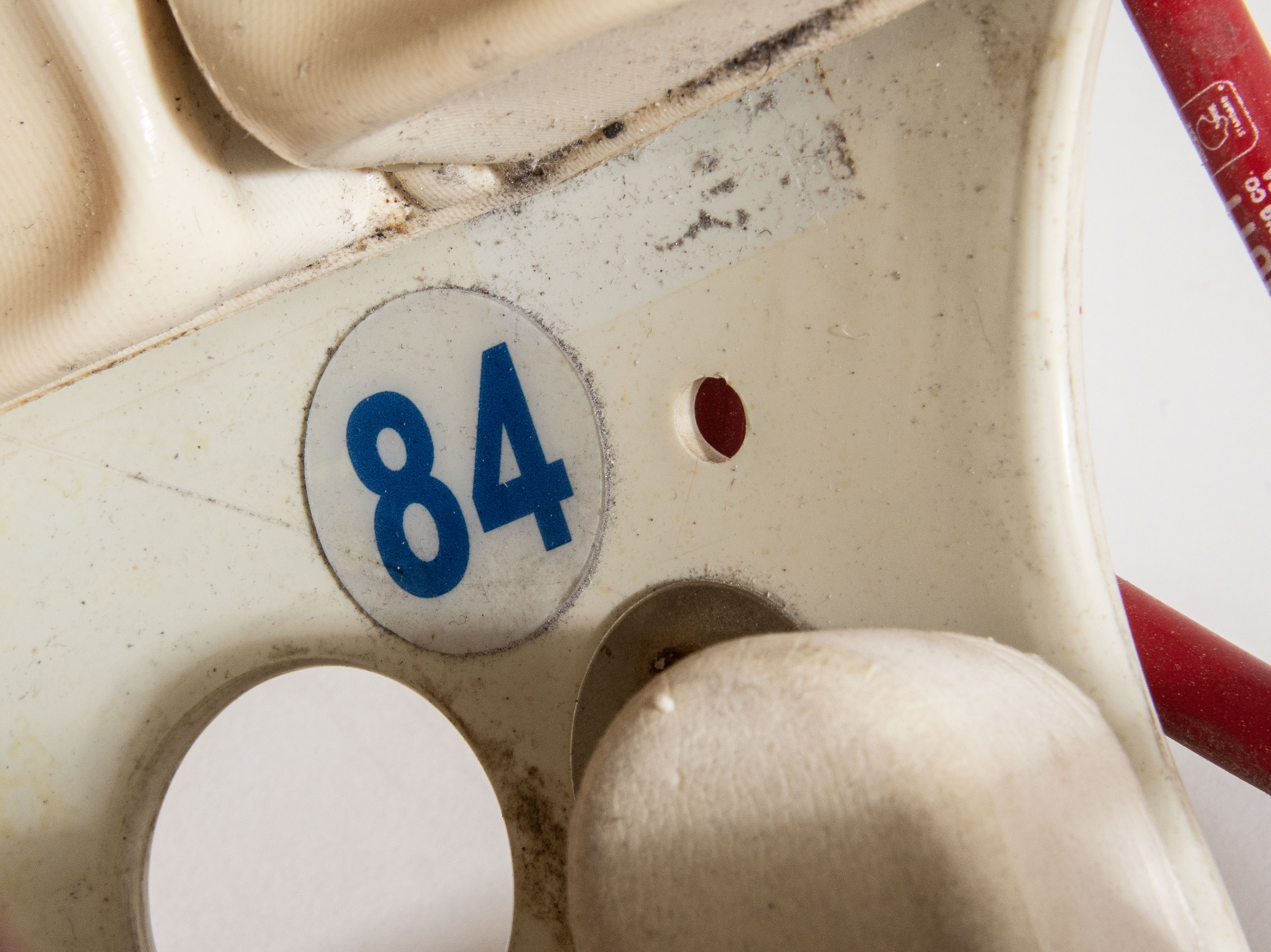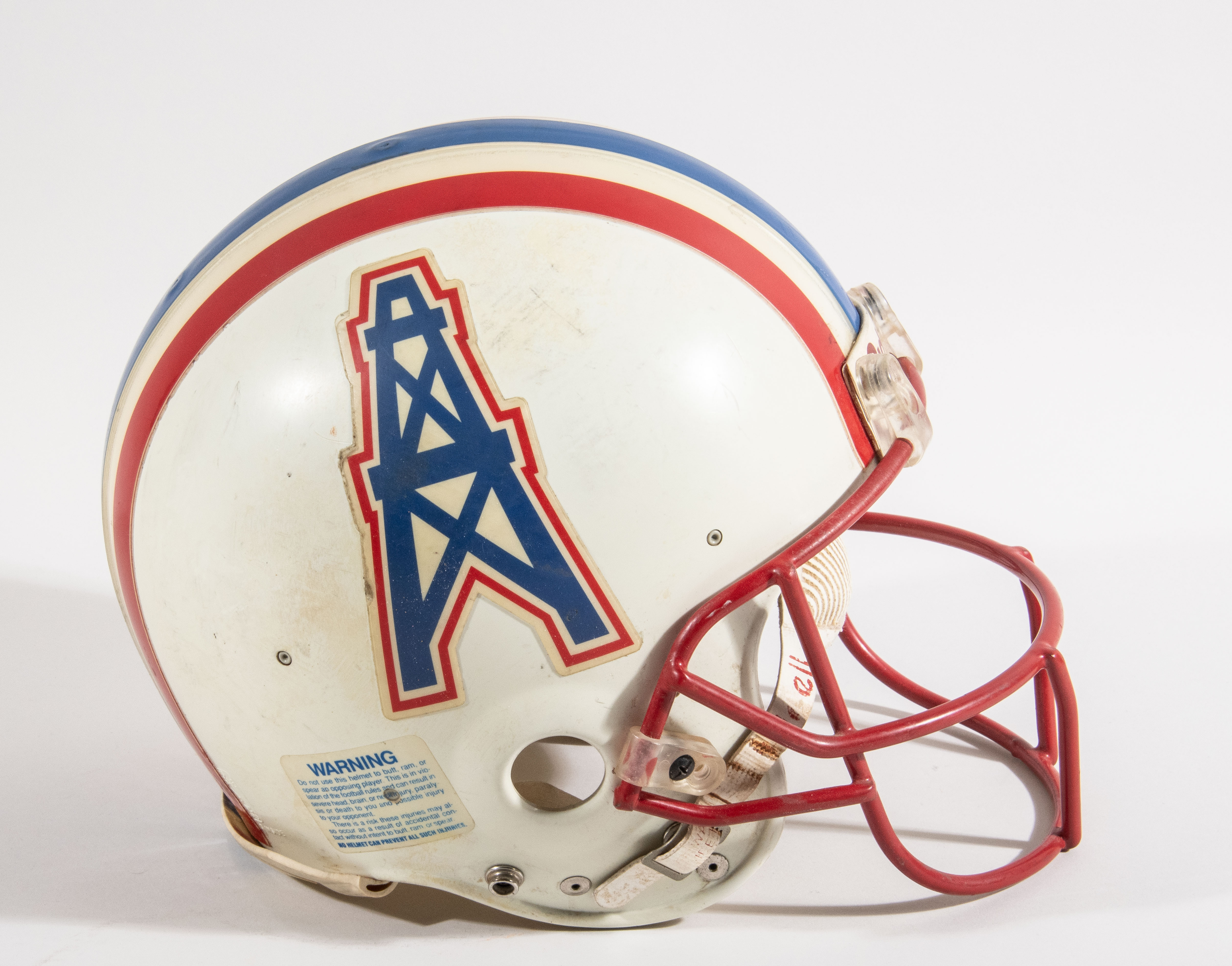 Description:Early 1990s Haywood Jeffires attributed Houston Oilers professional model helmet. Top of the line helmet by Riddell has Oilers team logo decals applied to either side and there are red and blue accents stripes. Player number "84" appears on two small circular stickers inside. Nice use is evident throughout. Jeffires played in Houston for (9) seasons and earned a trio of Pro-Bowl selections including 1991 when he lead the NFL in receptions. Includes LOA from Hunt Auctions: EX