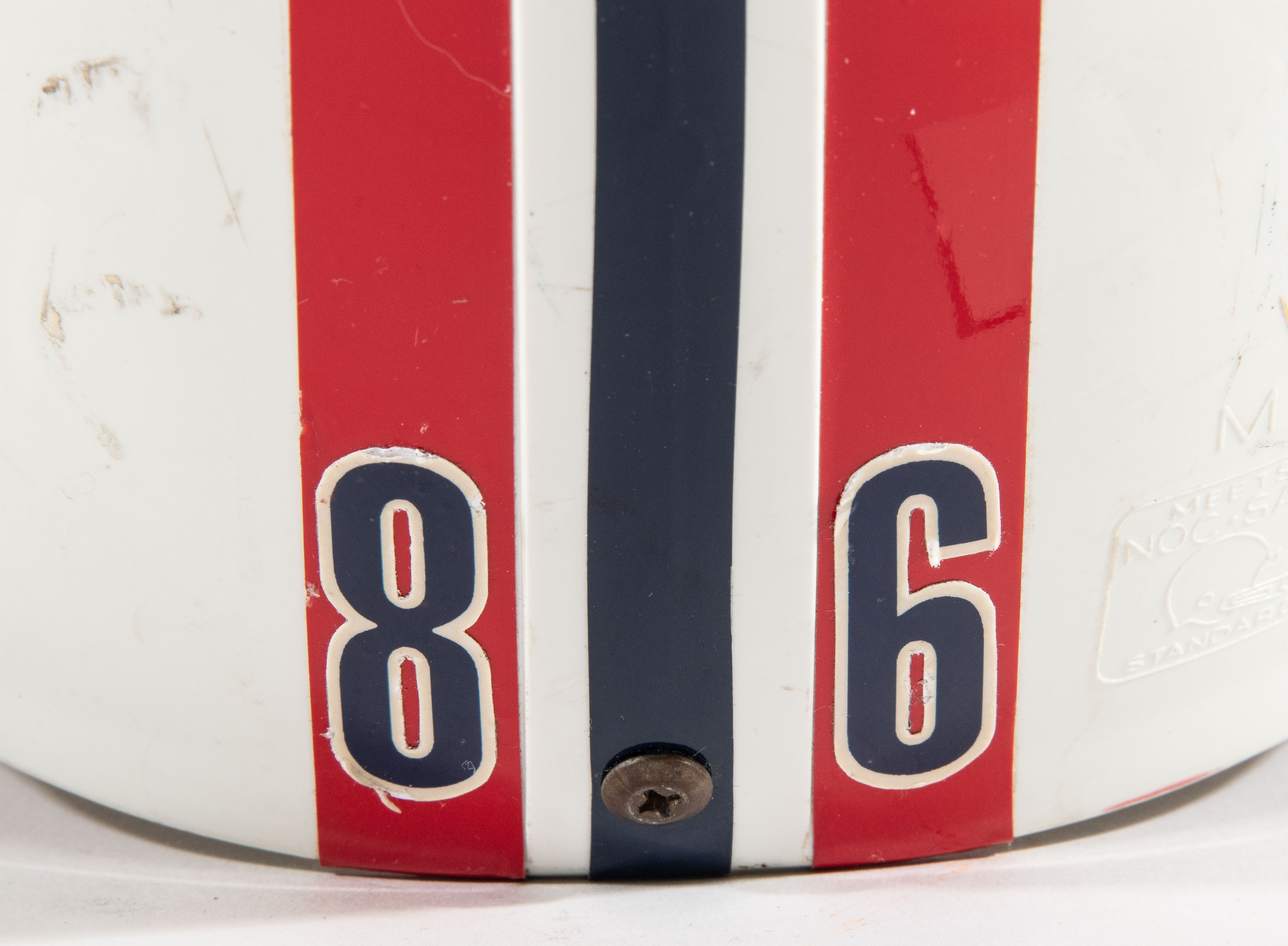 Description:Stanley Morgan New England Patriots professional model helmet c.late 1970s-80s. Riddell PAC-3 model helmet has Patriots logo decals applied to either side and red and blue accent stripes. Player number "86" decals appear on the back. Interior padding is intact and there are proper manufacturers labels along with size (7) label (which has "1/4" written on ink). Nice use is evident throughout. A strong representation from this Patriots team Hall of Fame member. Includes LOA from Hunt Auctions: EX
