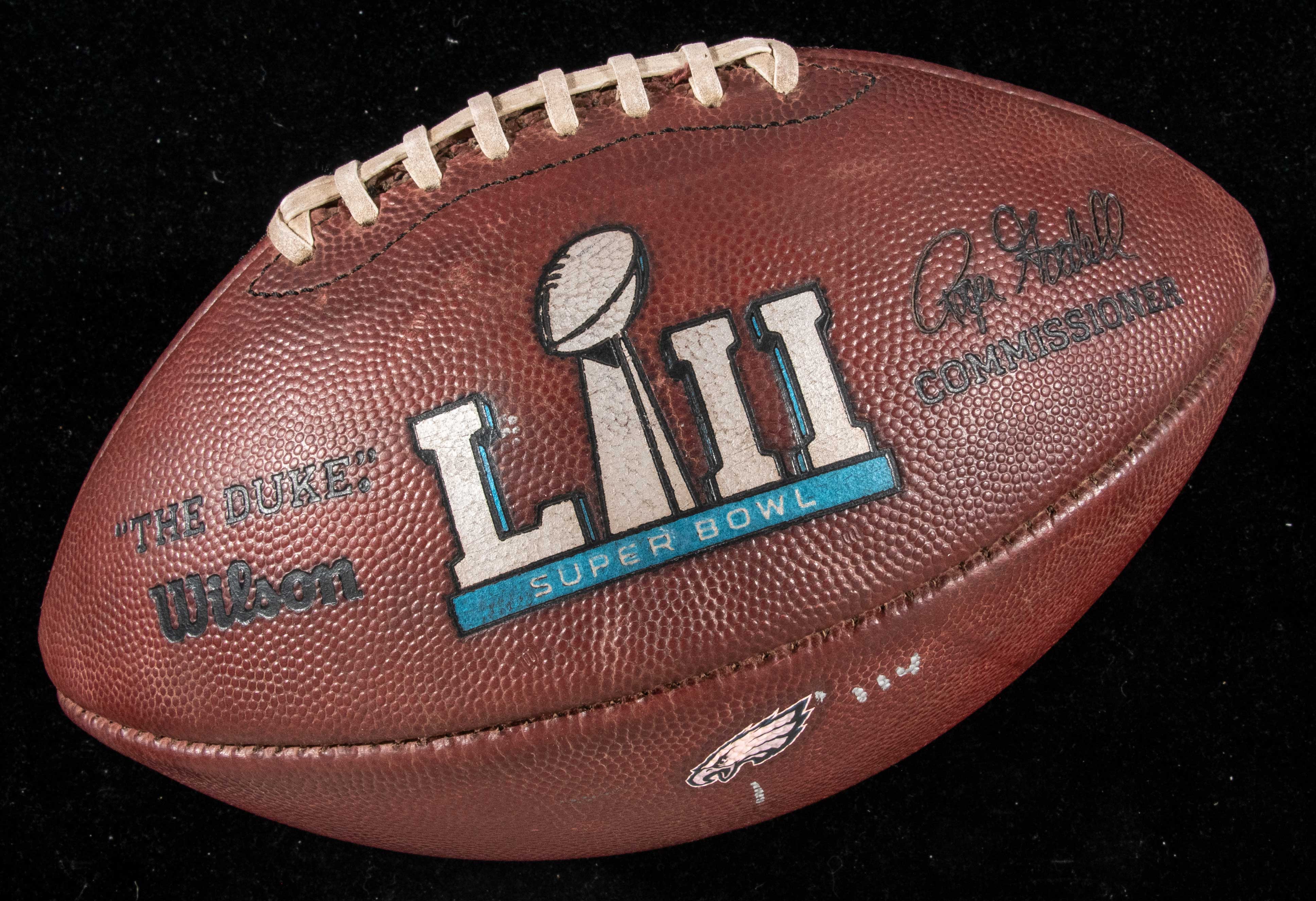 Description:Super Bowl LII game used football (Eagles defeat Patriots). Wilson NFL official Super Bowl LII game ball used by the Eagles offense during their historic victory over the New England Patriots. "1" and "114" official's markings are in silver marker around the Eagles logo. Visible use including discolored laces. Includes LOA from PSA in conjunction with the NFL which states that this "game-used football is one of the 54 total used by the Eagles" (serial #2N17504): EX