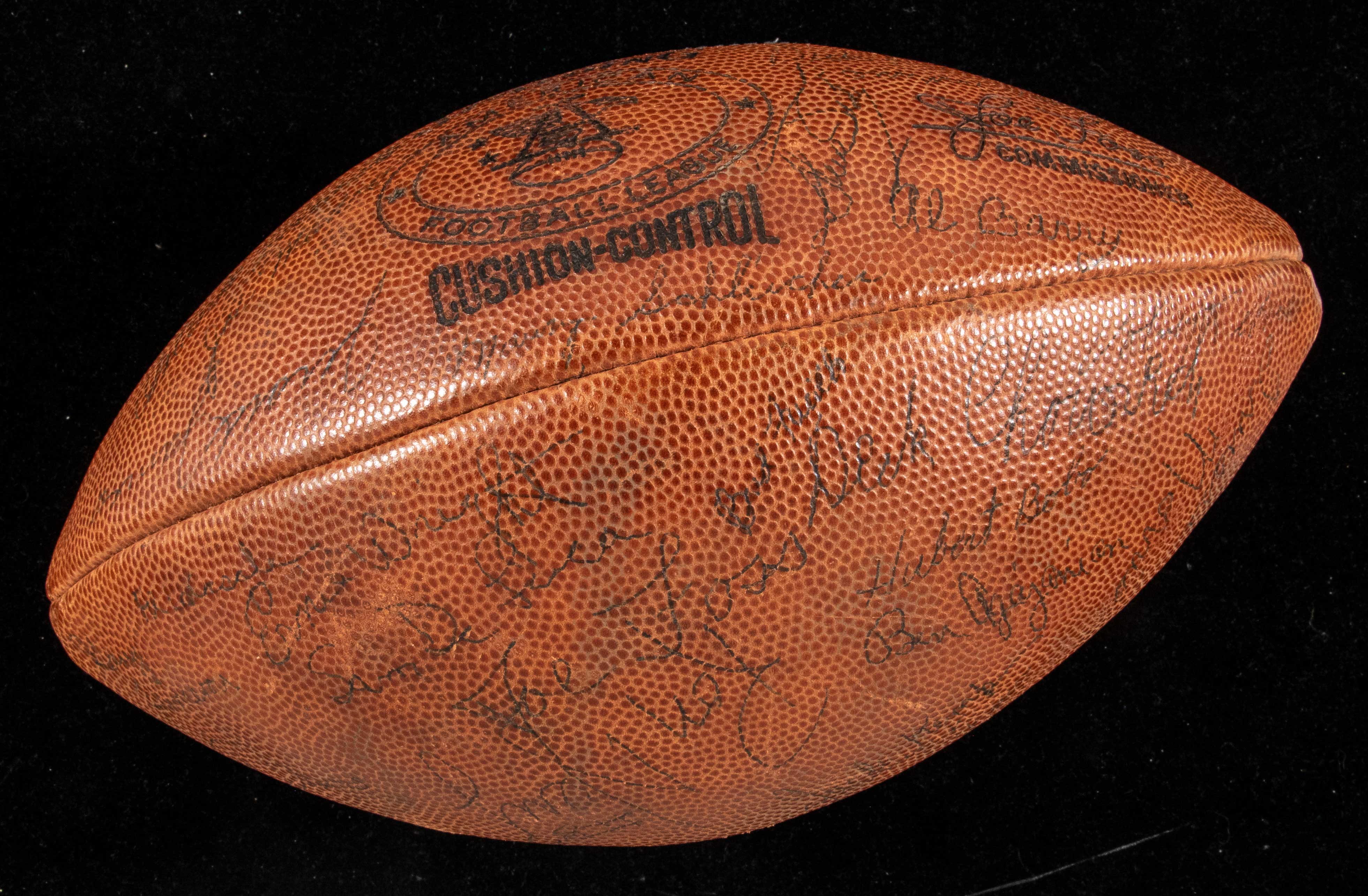 Description:1960 inaugural season Los Angeles Chargers team signed AFL football. Spalding AFL football signed by commissioner Joe Foss and by approx. (50) members of the 1960 West Division champion Chargers including assistant coach Al Davis, Ron Mix, Jack Kemp, Paul Maguire, Dick Harris, Paul Lowe, Fred Cole, Dave Kocourek, Don Rogers, Orlando Ferrante, Ernie Wright, Ben Agajanian, Dick Chorovich, Howie Ferguson, Ron Nery, Doyle Nix, and others. Signatures rate 2/3 to 7/8 (avg 6-6/7) out of 10. The ball remains inflated, with some scattered surface wear. Includes JSA auction LOA: EX