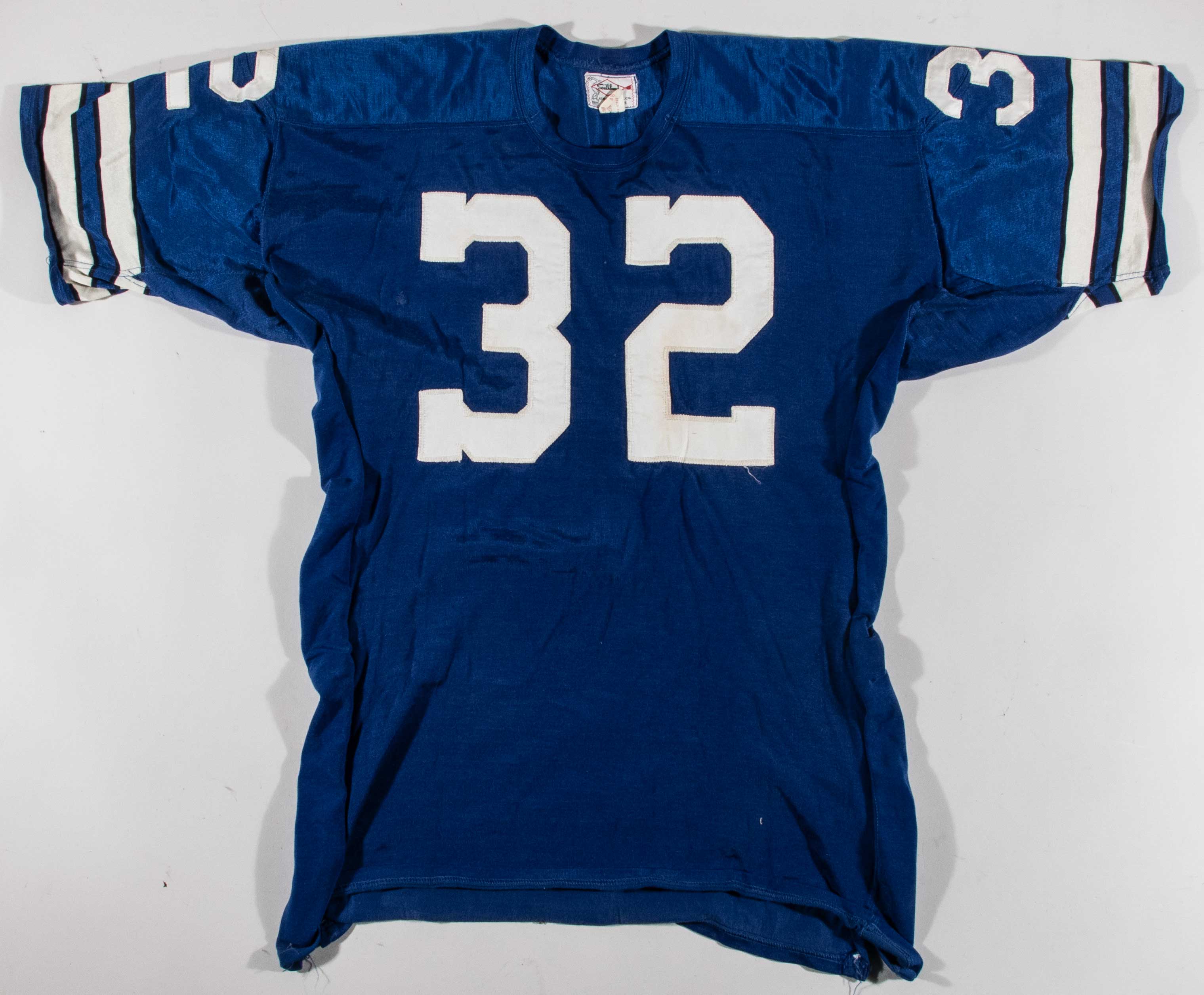 Description:Walt Garrison autographed Dallas Cowboys professional model jersey c.1967-68 (Team repairs). Southland size 48 blue road jersey with #32 sewn on the front, back, and shoulders. Southland tag is sewn inside the collar with attached flag tag noting size, wash instructions, and order number. Garrison signed the jersey in black marker. Signature rates 8 out of 10. Sensational including team repairs on the chest and back. Includes LOA from Hunt Auctions (jersey), and JSA auction LOA (autograph): EX