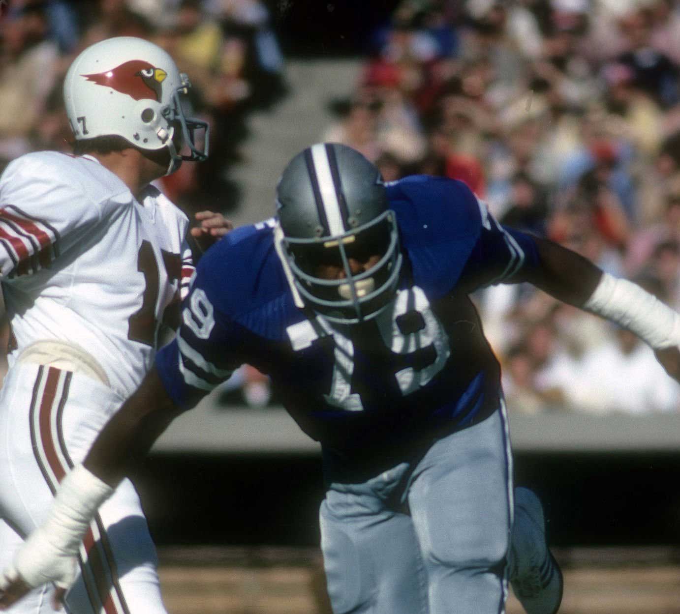 Description:Harvey Martin professional model Dallas Cowboys jersey c.early-mid 1970s (MeiGray LOA). Southland size 50 blue road jersey with "MARTIN" nameplate sewn across the back, along with #79 sewn on the front, back, and shoulders. Southland tag is sewn inside the collar with attached flag tag noting size, wash instructions, and order number. Outstanding use with abrasions on the front, and team repairs and abrasions on the right shoulder. MeiGray authentication confirms that Martin wore the jersey during the early-mid 1970s, and notes that the team wore blue Southland jerseys only (6) times from 1973-1976. Includes MeiGray authentication paperwork: EX