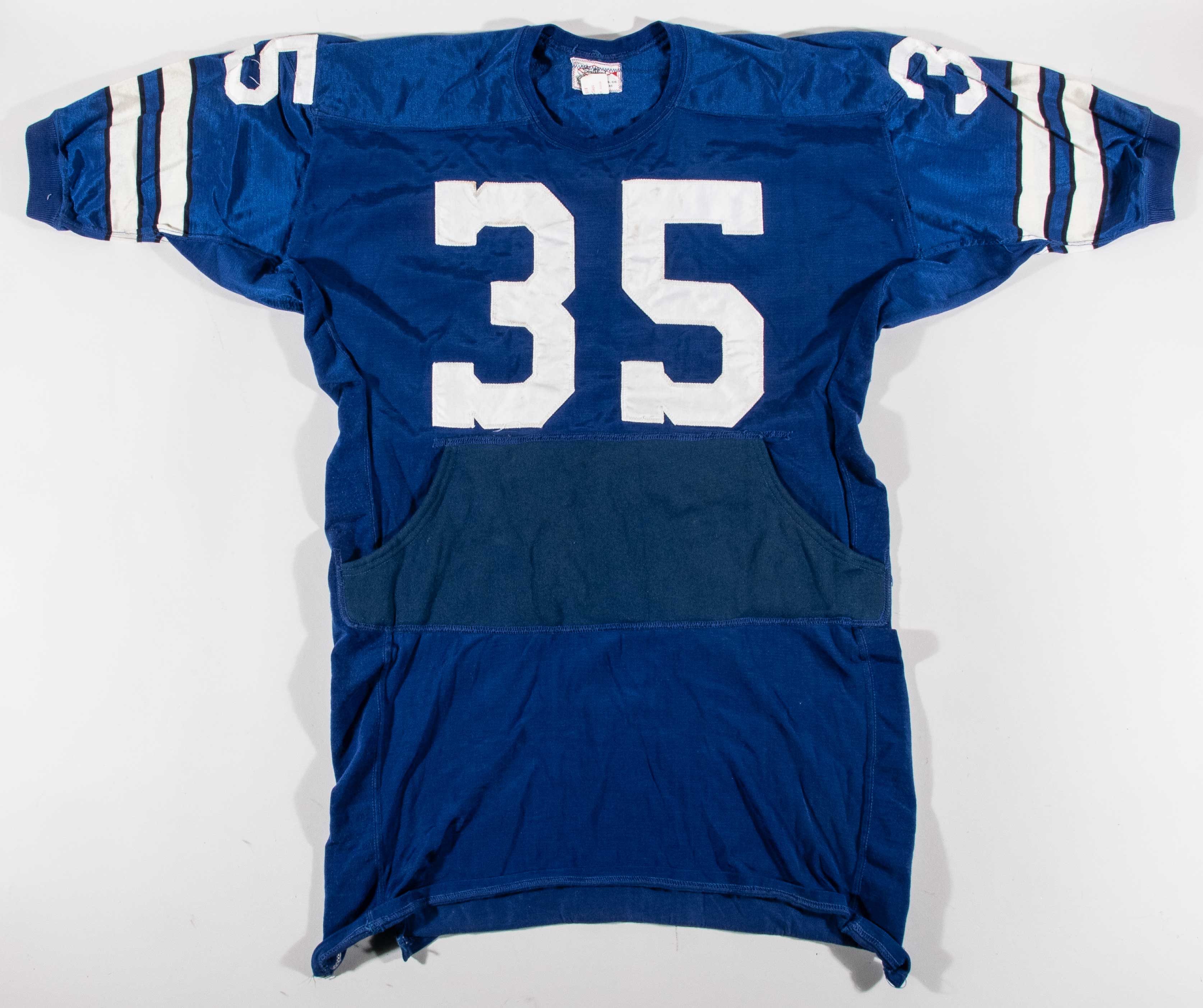 Description:Calvin Hill professional model Dallas Cowboys jersey with hand pouch c.1970-74 (Fine use with team repair). Southland size 48 blue road jersey with "HILL" nameplate sewn across the back, along with #35 sewn on the front, back, and shoulders. A hand pouch is sewn on the front, and Southland tag is sewn inside the collar with attached flag tag noting size, wash instructions, and order number. Sensational use with light number stains, and 1.5" team repair on the back. Includes LOA from Hunt Auctions: EX