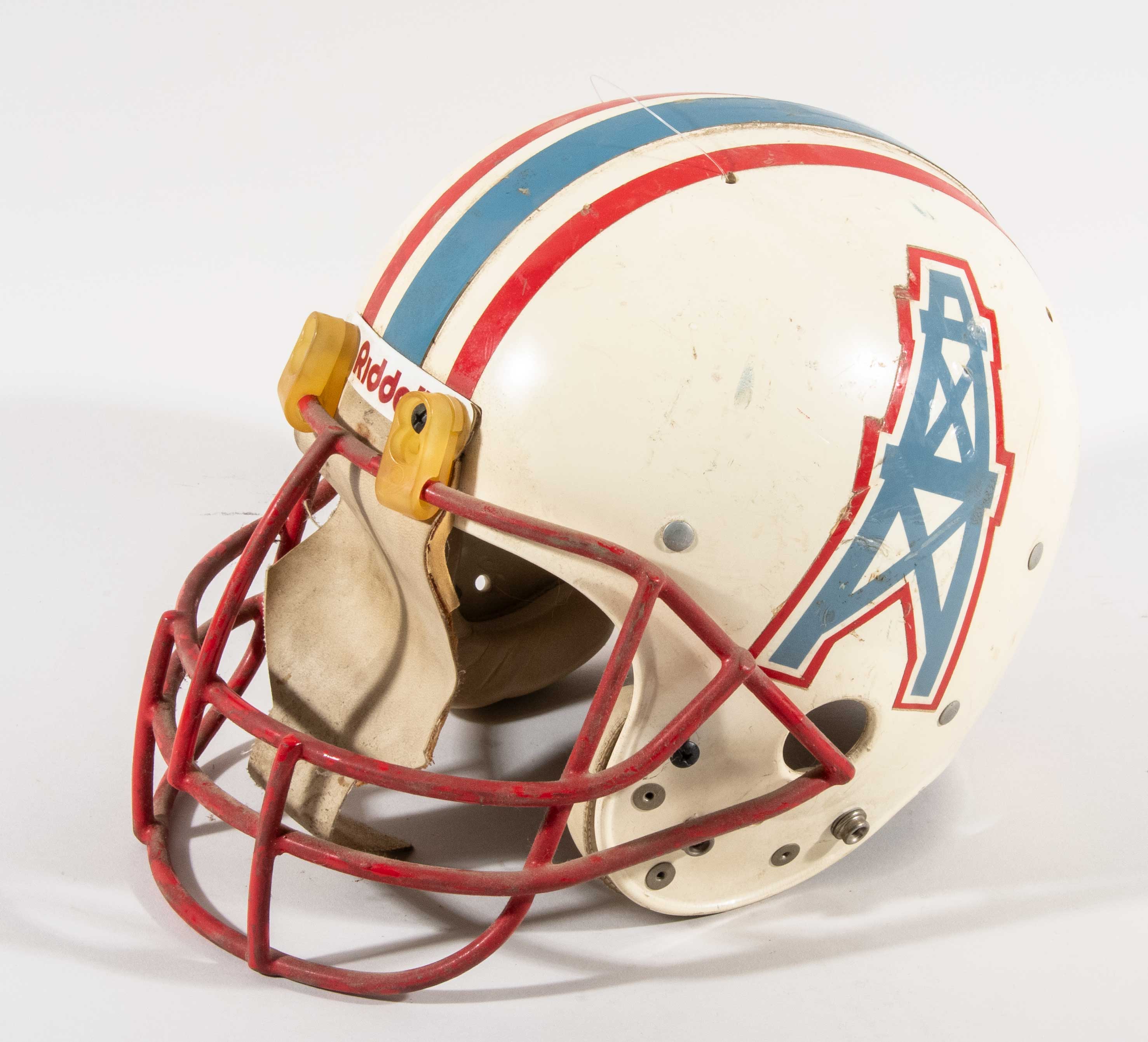 Description:Houston Oilers professional model helmet c.mid 1970s. Riddell suspension style Oilers helmet with "74" in the middle of the interior date code wheel. Multiple numbers written inside, making player identification unknown. Heavy wear with forehead padding partially detached, and facemask only attached at the top. Includes LOA from Hunt Auctions: VG