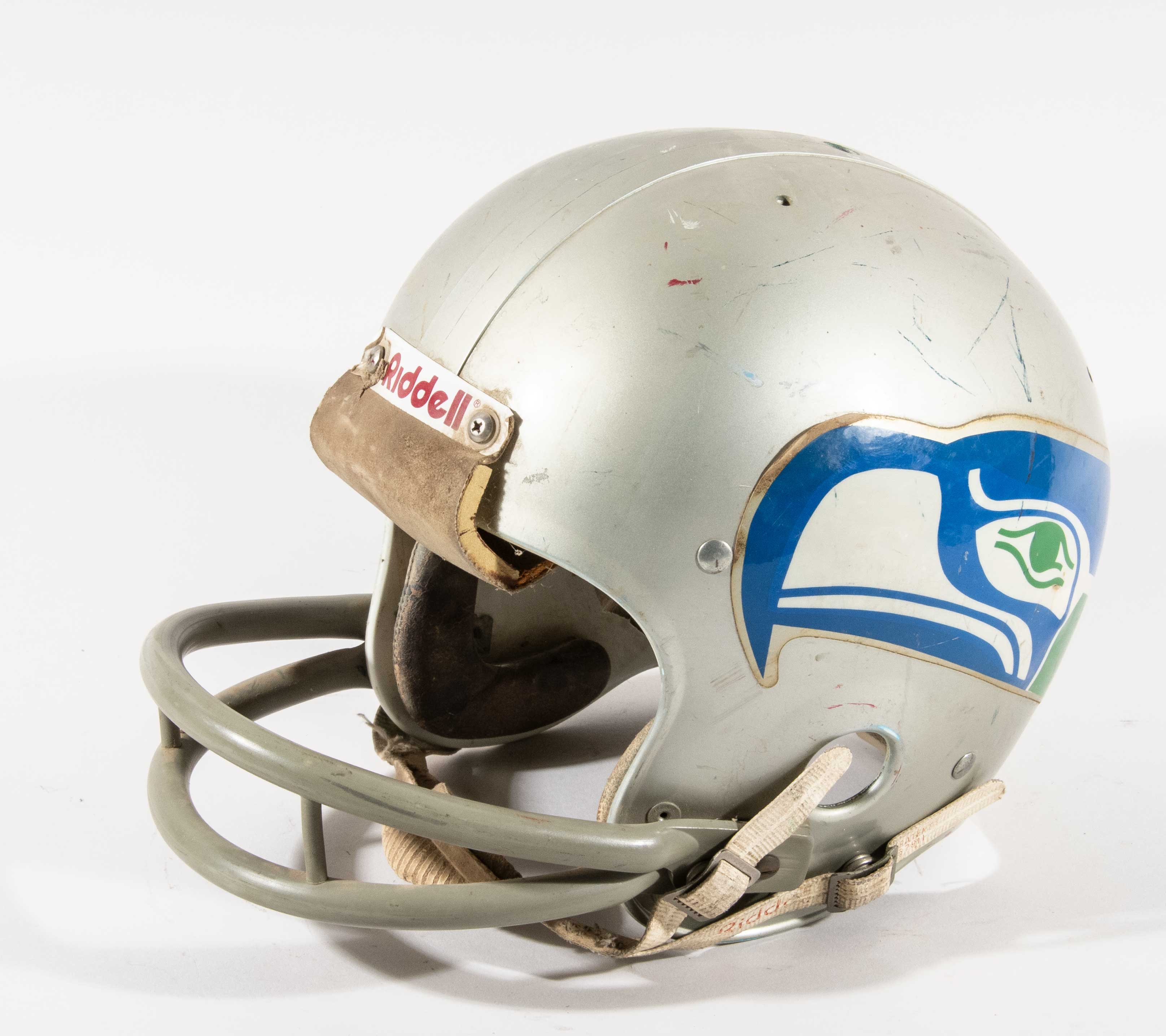 Description:Seattle Seahawks professional model helmet c.late 1970s. Riddell suspension style Seahawks helmet with #82 written inside. A pad is covering most of the date code wheel, making player identification difficult. Splendid use with numerous scuff marks on the crown (ear pads have dried and hardened. Includes LOA from Hunt Auctions: EX