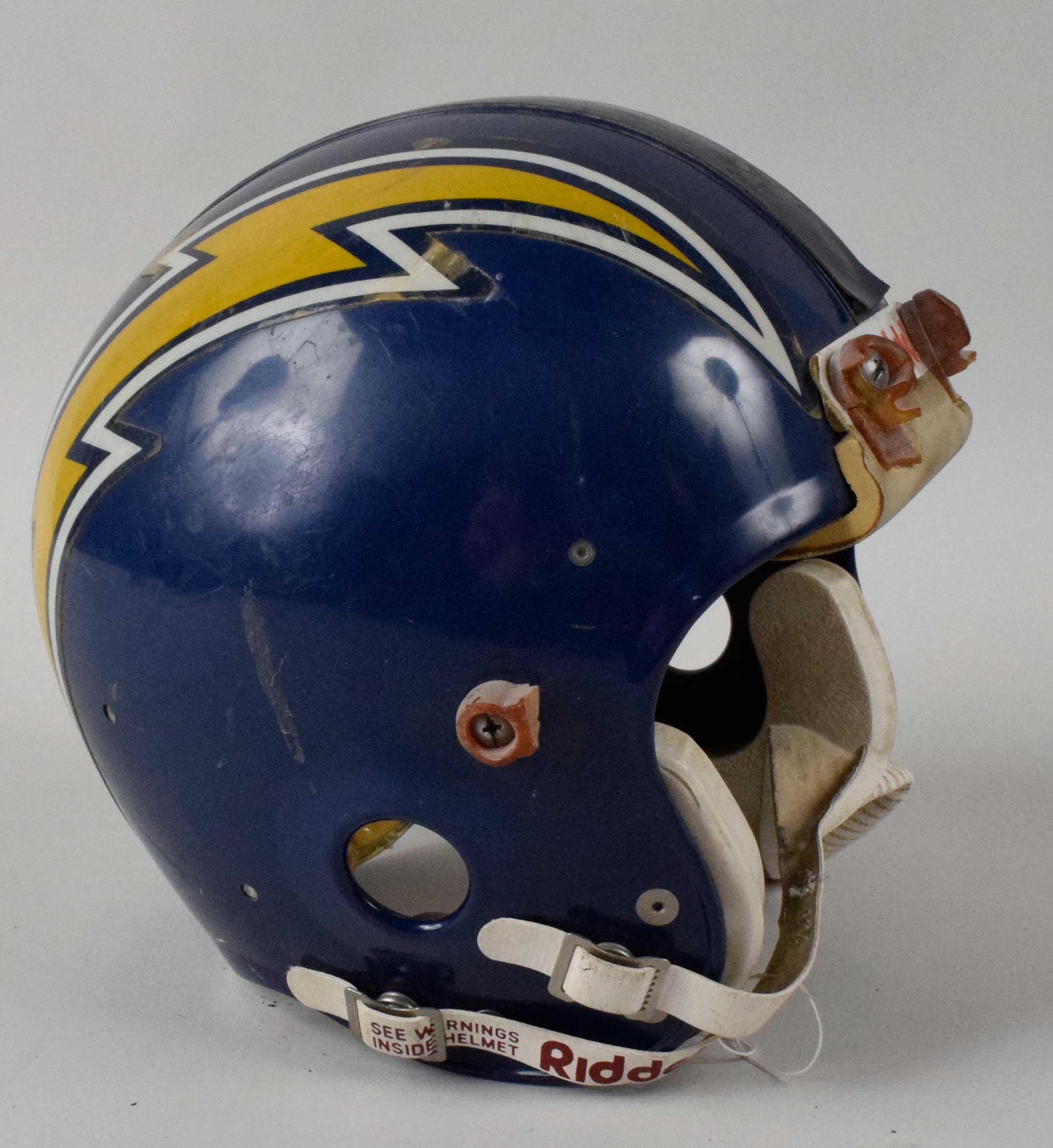 Description:San Diego Chargers professional model helmet c.late 1970s. Riddell PAC-3 model helmet with KRA-LITE II stamping on the back. "0 8" is stamped above "77" in the interior date code circle, and "3" is stamped above "H7" on the Riddell sticker inside. Significant use with scattered scuff marks, and some peeling at the back on the stripe decal going over the center of the helmet. Missing facemask, but interior padding remains intact. Includes LOA from Hunt Auctions: VG
