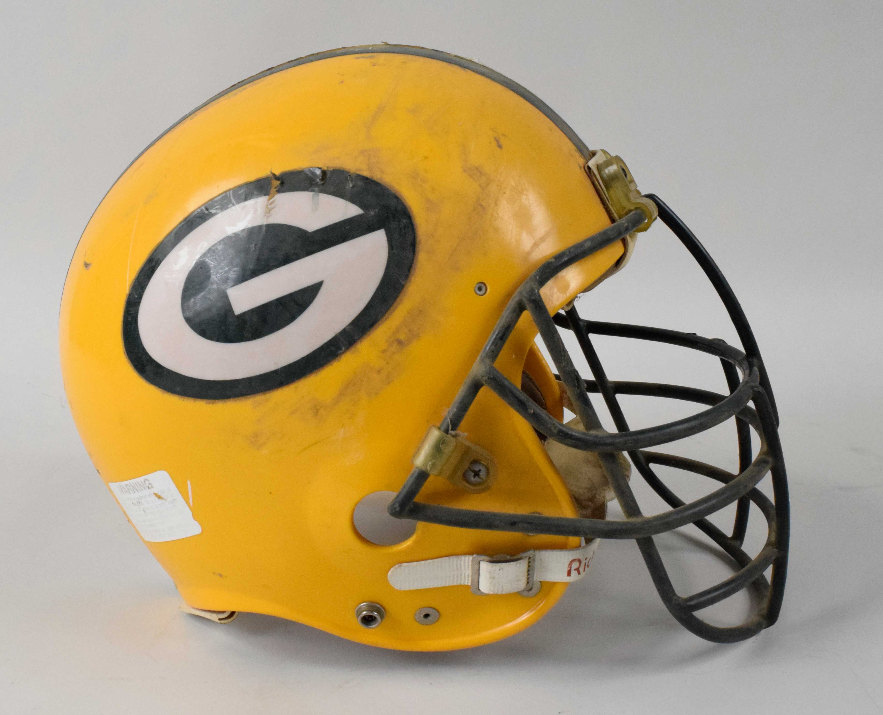 Description:Green Bay Packers professional model helmet c.1980s-90s. Riddell VSR-3 Packers helmet without any player number identifications. Excellent use with heavy scratches and scuff marks on the crown. Interior padding remains intact, but has some storage residue inside. Includes LOA from Hunt Auctions: EX