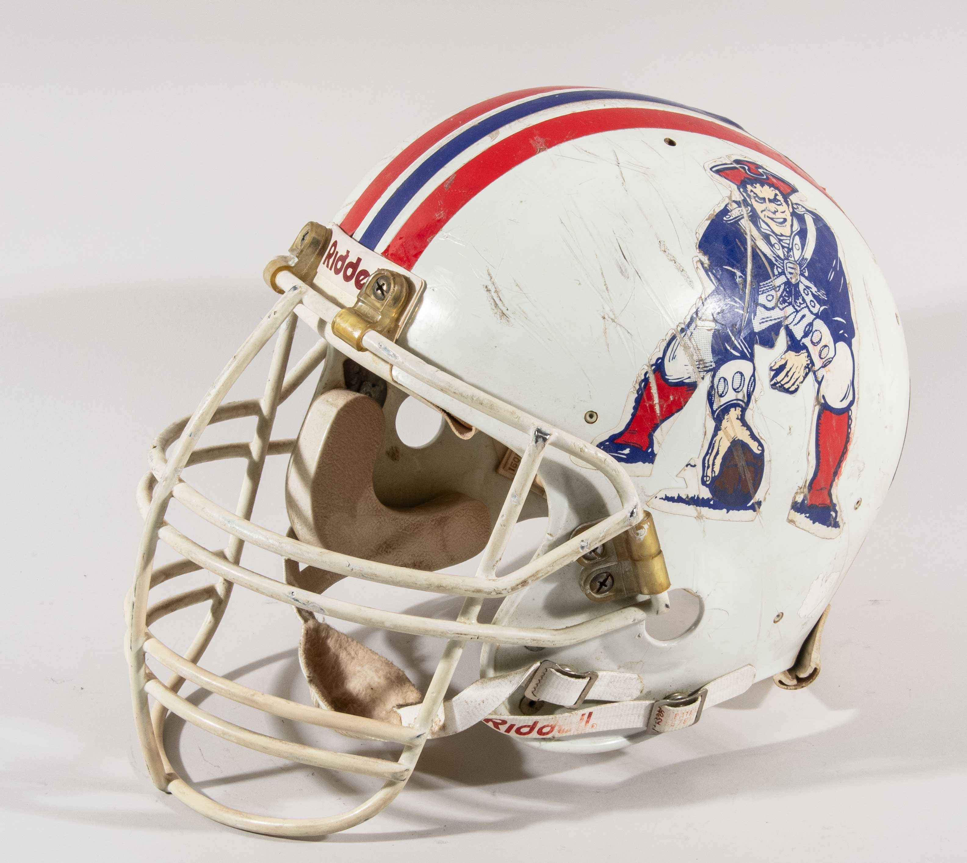 Description:New England Patriots professional model helmet attributed to Damian Johnson c.1990. Riddell AF2 model Patriots helmet with #68 decals and American flag sticker on the back. Marvelous use with heavy scratches covering the crown, and areas of surface loss on the facemask. Includes LOA from Hunt Auctions: EX