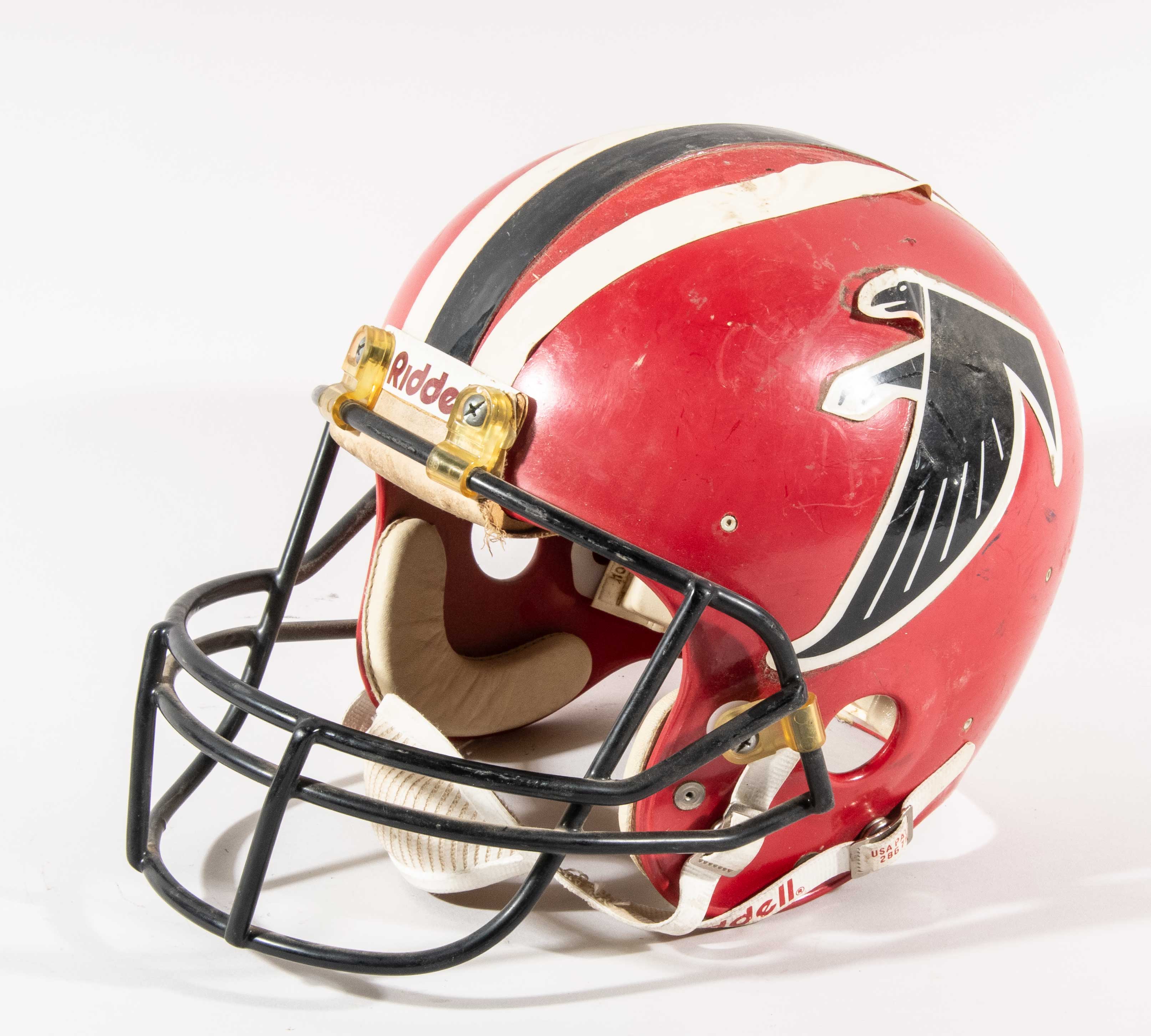 Description:Atlanta Falcons professional model helmet attributed to Floyd Hodge c.early-mid 1980s. Riddell brand Falcons helmet (interior model number sticker no longer present) with #83 decals on the back, 1984 recertification sticker inside, and #83 also written on the interior. Sensational use with scattered scuff marks and some peeling to the decals. Includes LOA from Hunt Auctions: EX