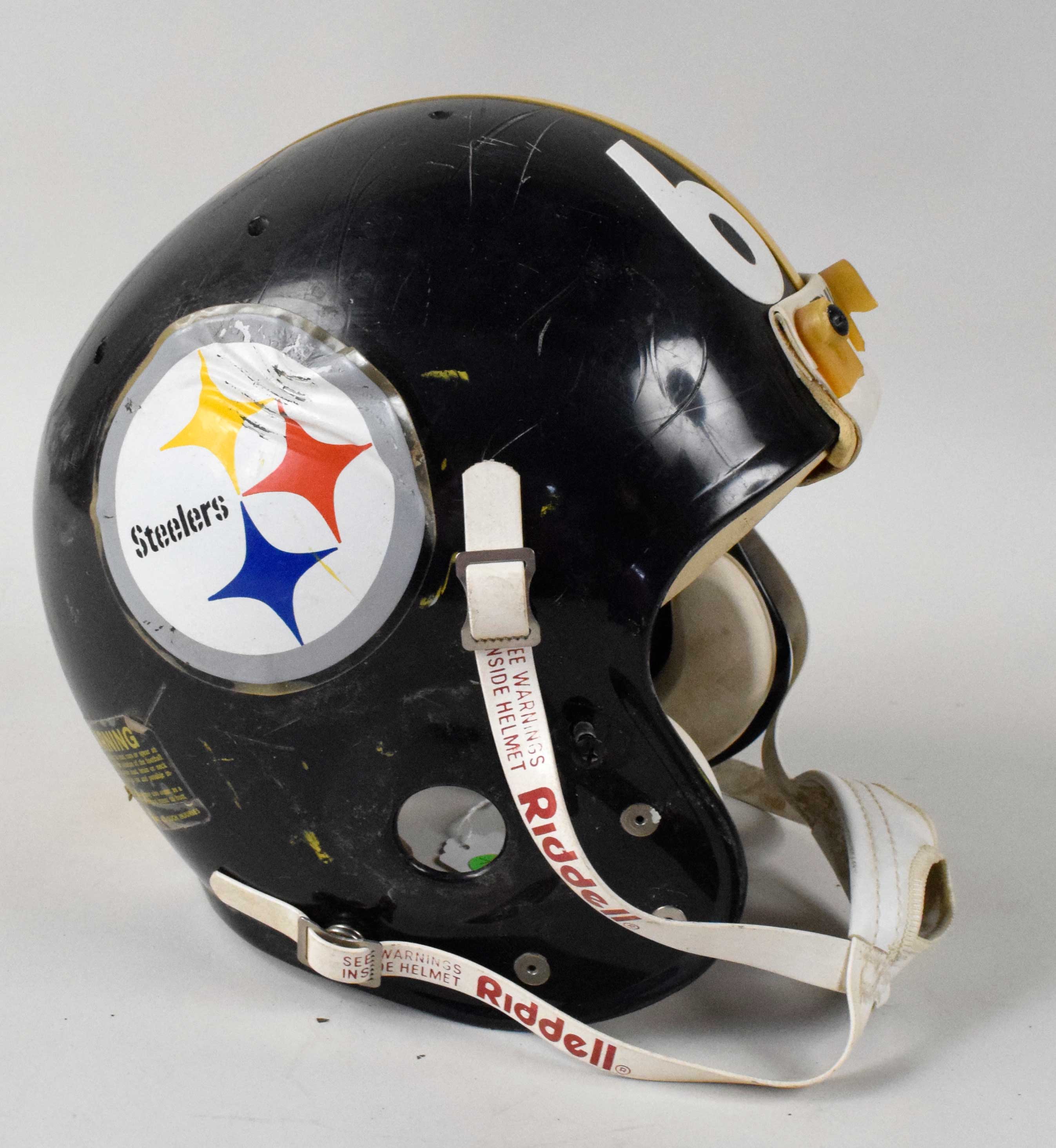 Description:Pittsburgh Steelers professional model helmet c.mid 1980s - early 1990s. Bike brand Steelers helmet with player #64 decals on the front and back. "5 85" stamping can still be seen on the back below other heavily worn stampings, and 1991 Riddell recertification sticker is inside. Wonderful use with numerous scratches and scuff marks on the crown and wear to the team logo decal. Missing facemask, but interior padding remains intact. Includes LOA from Hunt Auctions: VG/EX