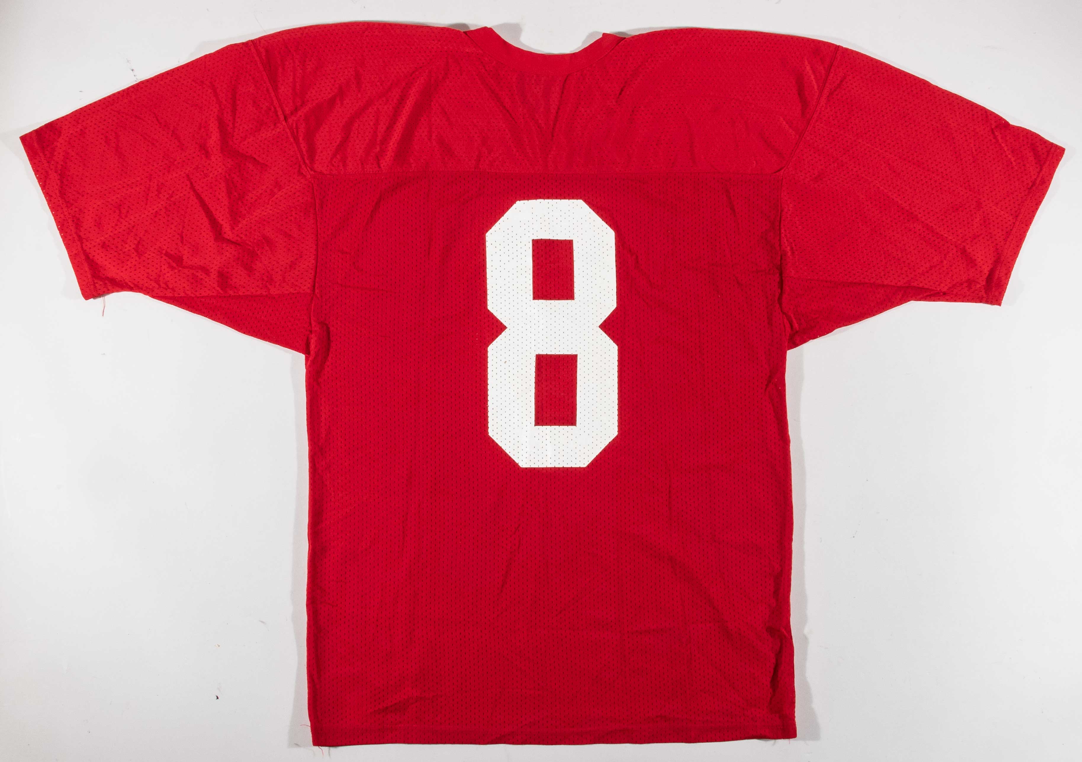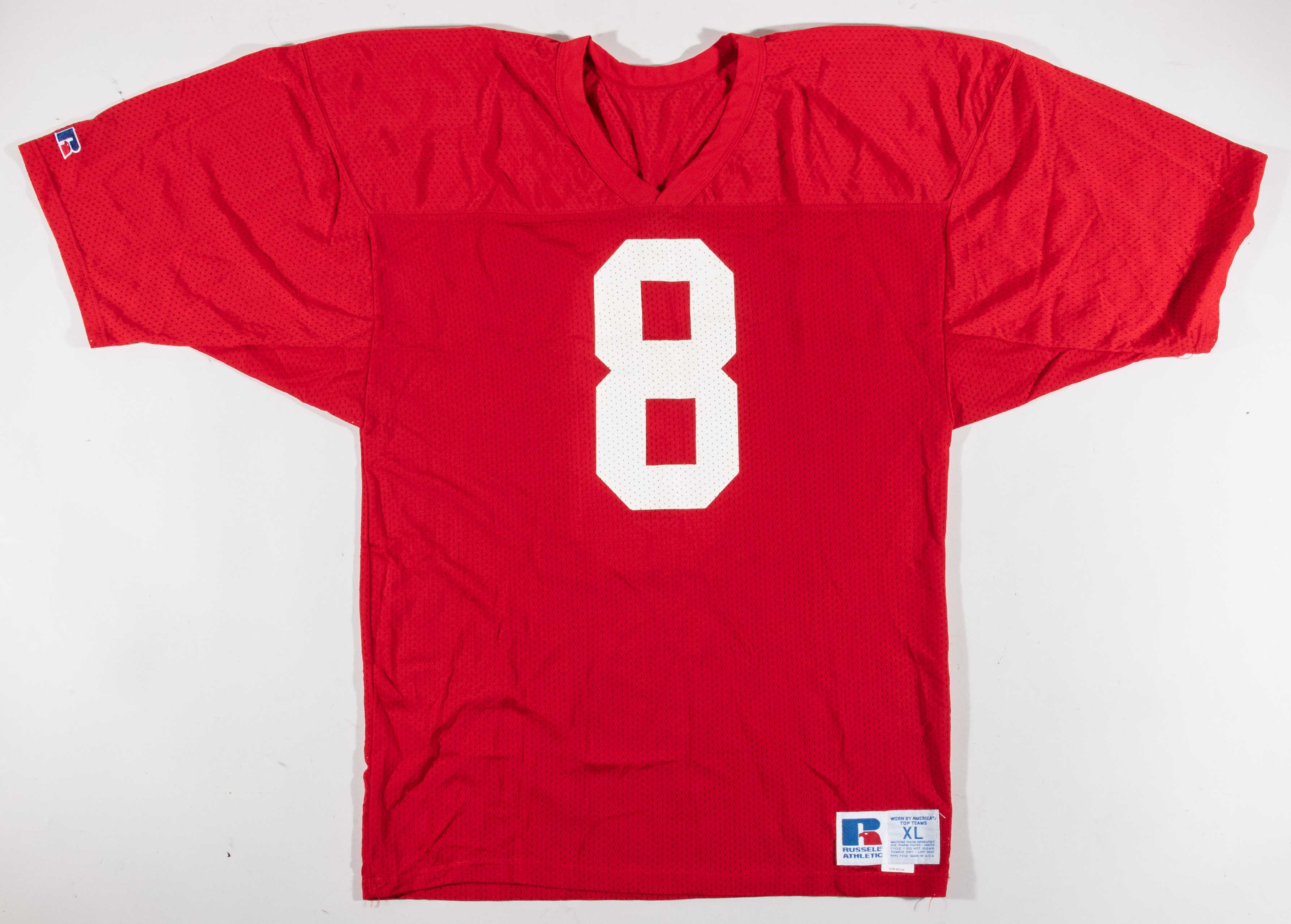 Description:Steve Young professional model San Francisco 49ers practice jersey c.1987-89. Red mesh jersey with #8 on the front and back, and Russell Athletic (size XL) tag on the front tail with "100% Nylon" flag tag attached. Light overall use/wash wear. Includes LOA from Hunt Auctions: EX/MT