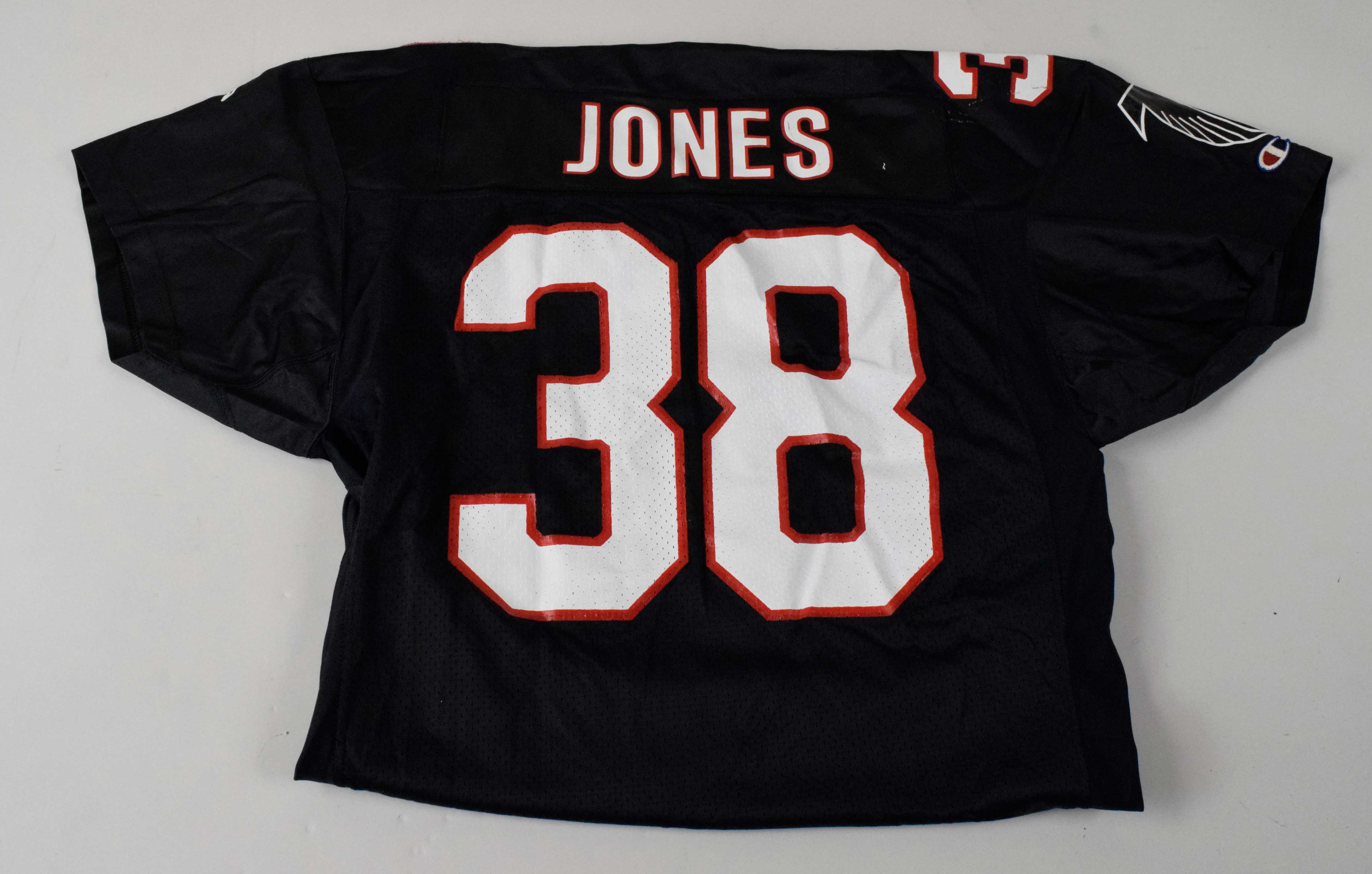 Description:1990 Keith Jones professional model Atlanta Falcons jersey with 25th season patch. Champion size 46 black home jersey with "JONES" nameplate sewn across the back, along with #38 on the front, back, and shoulders. Falcons 25th season patch is sewn on the left shoulder, and Champion tag is sewn on the front tail with "100% Nylon" flag tag attached. Visible use including impact marks on the right shoulder. Includes LOA from Hunt Auctions: EX
