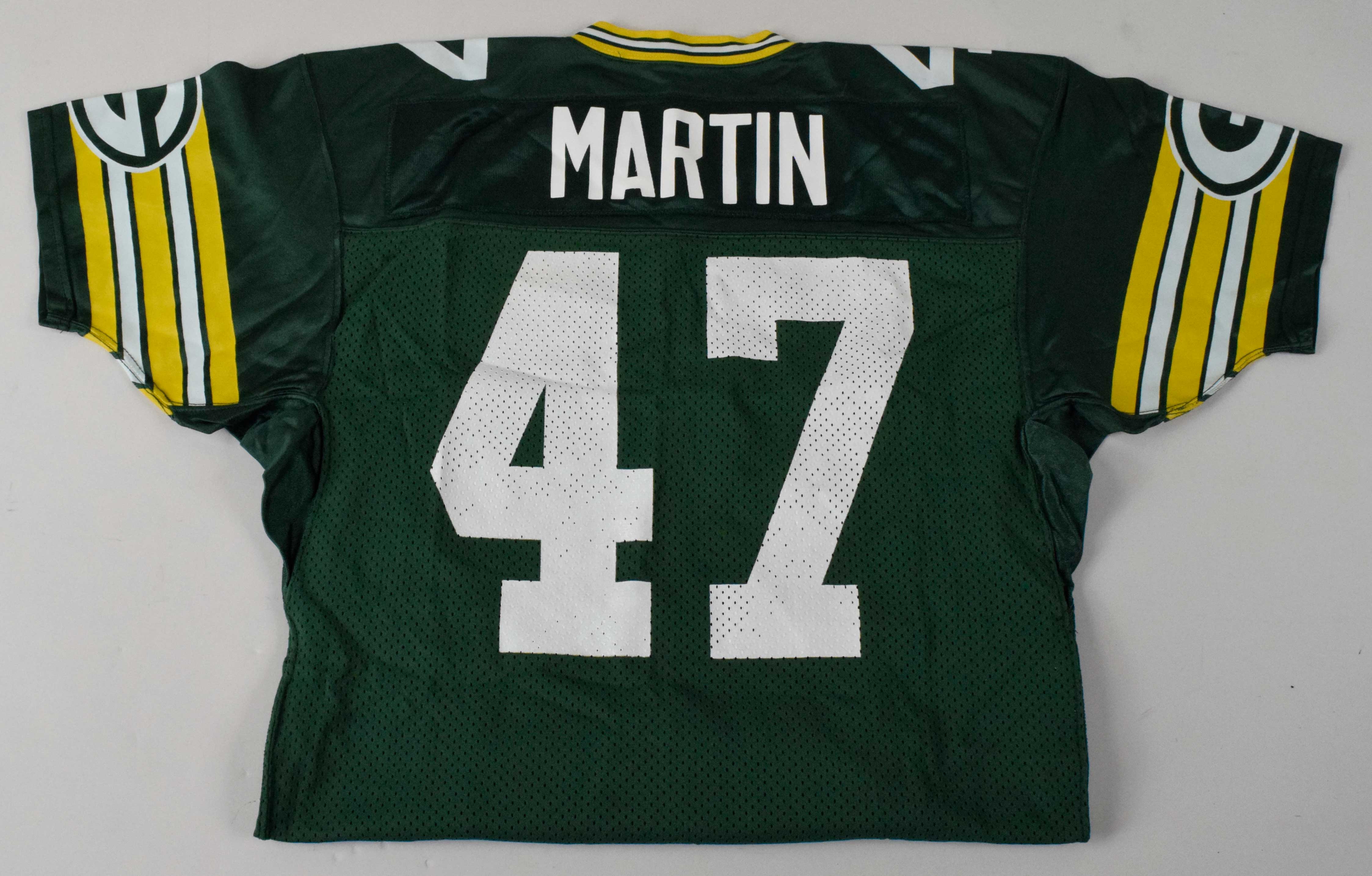 Description:1990 Tracy Martin professional model Green Bay Packers jersey with hand pouch (team repair). MacGregor Sand-Knit size 44 green home jersey with "MARTIN" nameplate sewn across the back, along with #47 on the front, back, and shoulders. A hand pouch is sewn on the front, maker tagging is sewn on the front tail including "Designed & Tailored Exclusively for the Green Bay Packers" tag, and "Regular" "44" flag tags are inside the collar. Despite being released following the preseason, Martin's jersey shows great use with impact marks on the right shoulder and a team repair on the right sleeve. Includes LOA from Hunt Auctions: EX