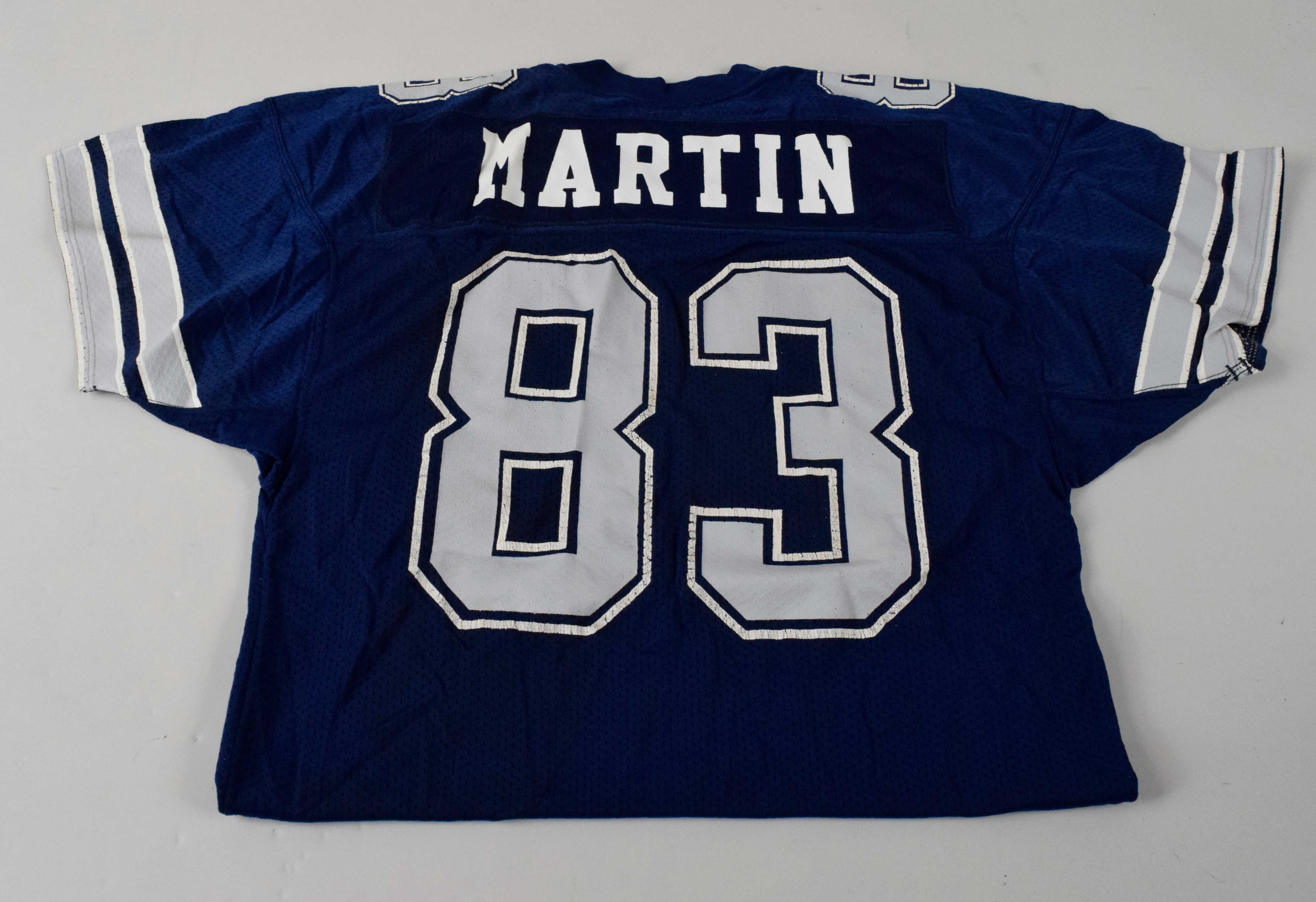 Description:Kelvin Martin professional model Dallas Cowboys jersey c.1987-90. Russell Athletic size 46 blue road jersey with "MARTIN" nameplate sewn across the back, along with #83 on the front, back, and shoulders. Russell Athletic tag is sewn on the front tail, with attached flag tag identifying material and wash care. Areas of cracking around the white number trim, and very supple fabric. Includes LOA from Hunt Auctions: EX