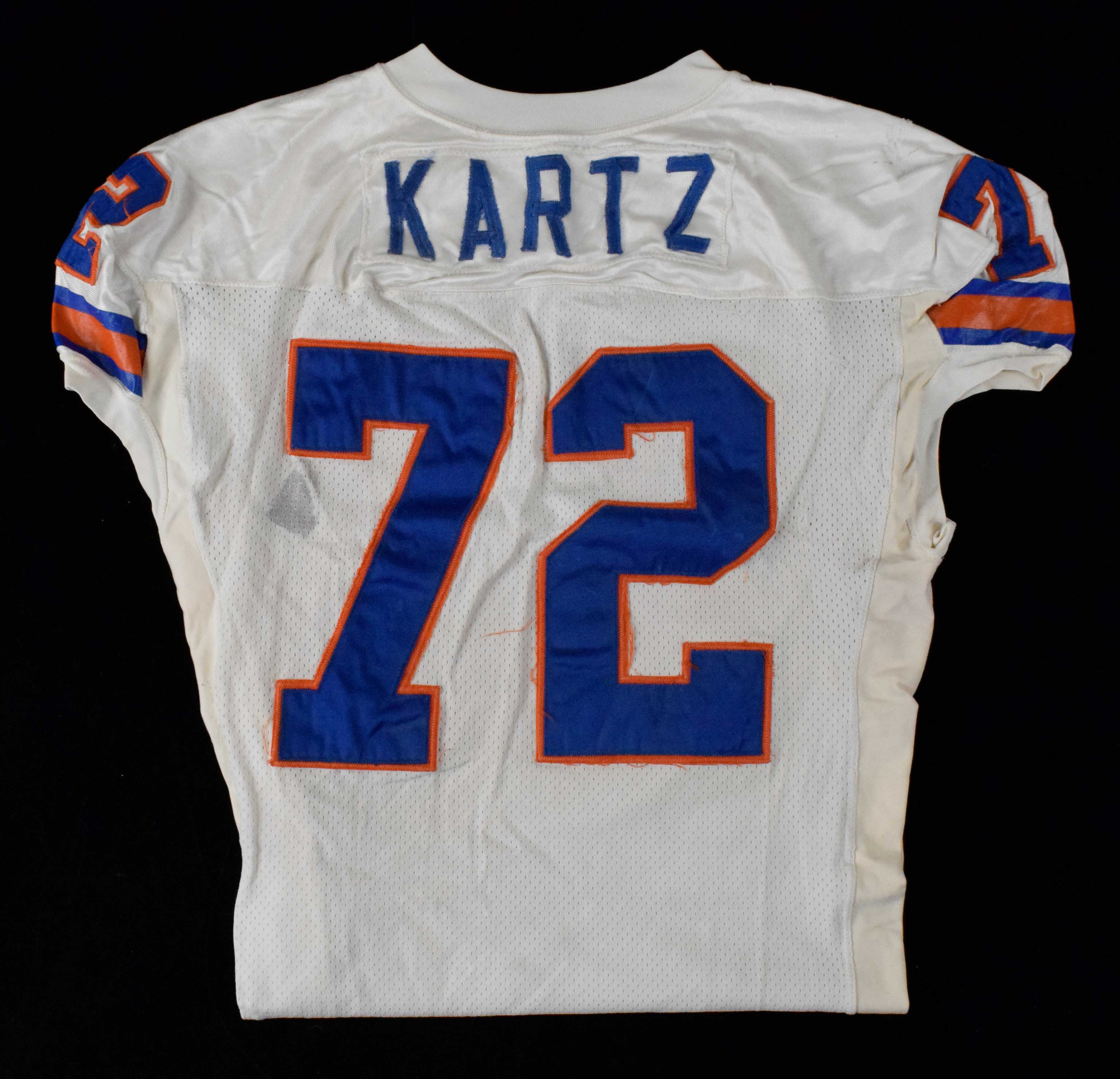 Description:Keith Kartz professional model Denver Broncos jersey c.1989-90 (team repairs). Wilson size 52 white road jersey with "KARTZ" nameplate sewn across the back, along with #72 sewn on the front, back, and shoulders. Wilson tag is sewn on the front tail, but has been cut into two portions, with #72 written on the lower portion. Fabulous use with stains as well as team repairs on the back and both shoulders. Includes LOA from Hunt Auctions: EX