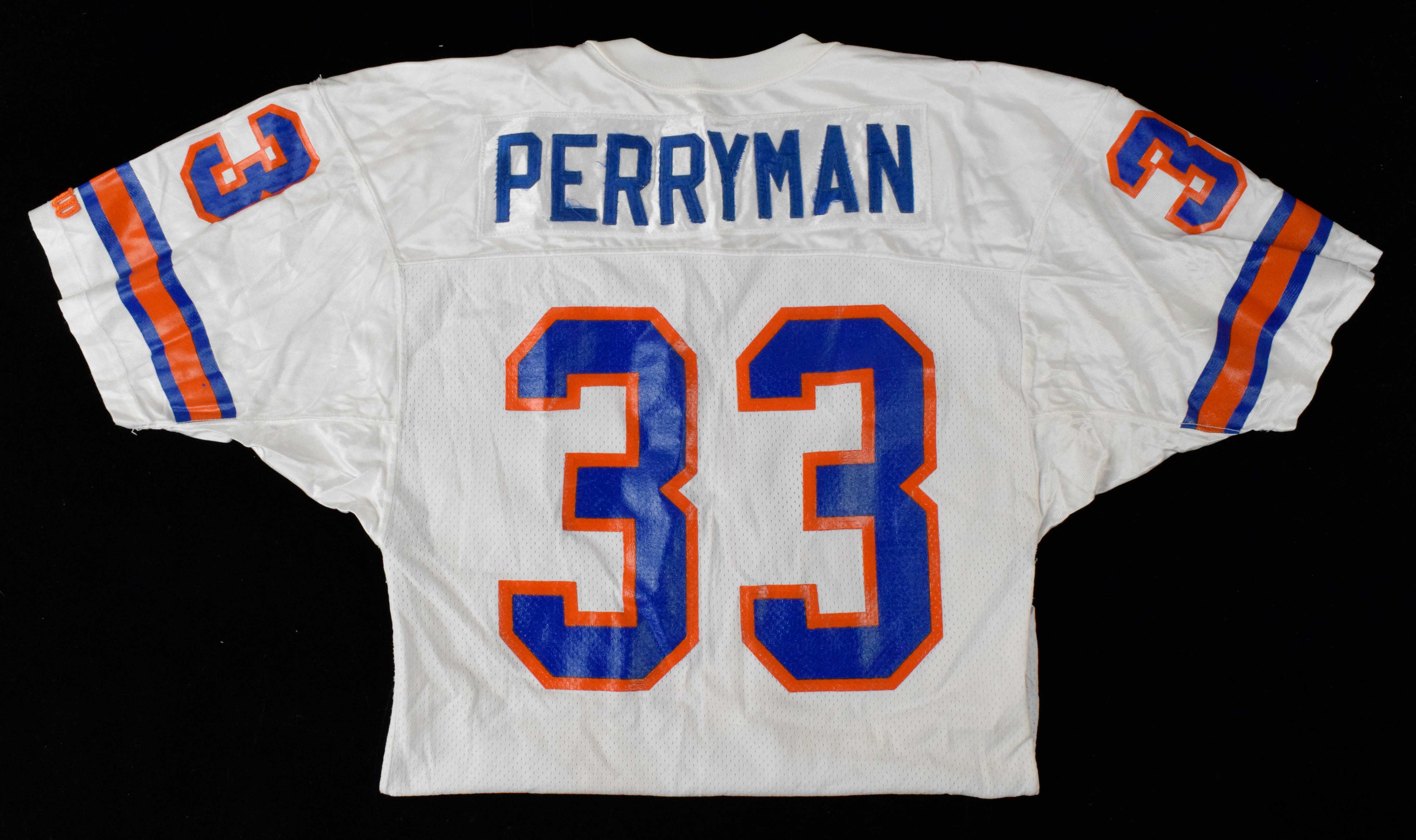 Description:Bob Perryman professional model Denver Broncos jersey c.1991 (team repairs). Wilson size 44 white road jersey with "PERRYMAN" nameplate sewn across the back, along with #33 on the front, back, and sleeves. NFL shield patch is sewn on the front collar, and Wilson tag is sewn on the front tail with "44" (size) and "BU" (1989 date code) flag tags attached likely indicating a 1989 shell jersey was used to create this jersey for Perryman when he arrived to the team in 1991. Excellent use with team repairs on both shoulders. Includes LOA from Hunt Auctions: EX