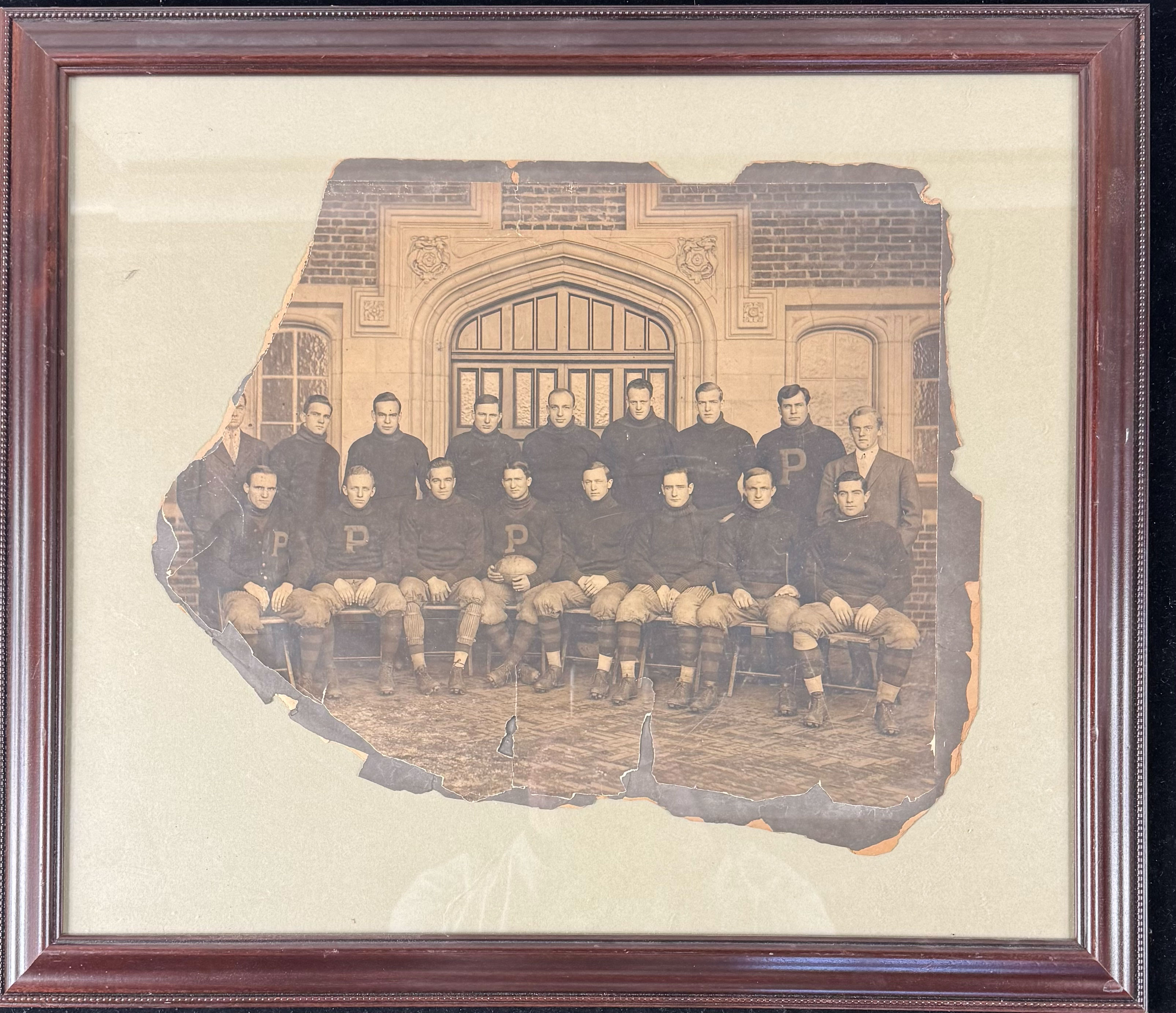 Description:1907 University of Pennsylvania football team photograph. Large format photograph showing uniformed members of the Penn Quakers who claimed a National Championship in 1907. Presently displayed in a 20.5"x23.5" frame (modern) the piece remains on its' original mount (14"x17" at extremes) and there are large areas of loss/chipping to both mount and the photograph itself. Other flaws including some tears and cracks. Back is visible and has handwritten identifiers throughout: See description
