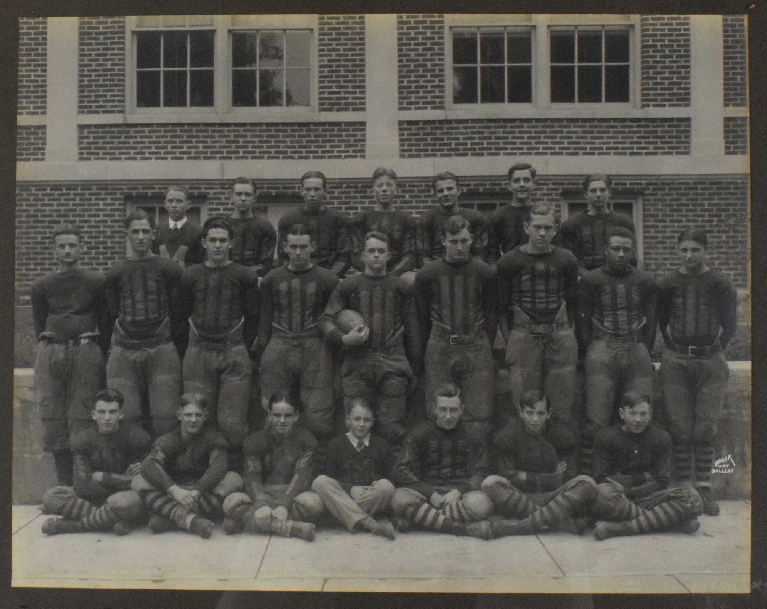 Description:Football team photograph with African American player c.1920s. Very sharp large format photograph of what is likely a college football team comprised of players wearing high quality friction strip jerseys. Among them is an African American player. In 15.25"x19.25" frame with a touch of light natural wear: Overall EX