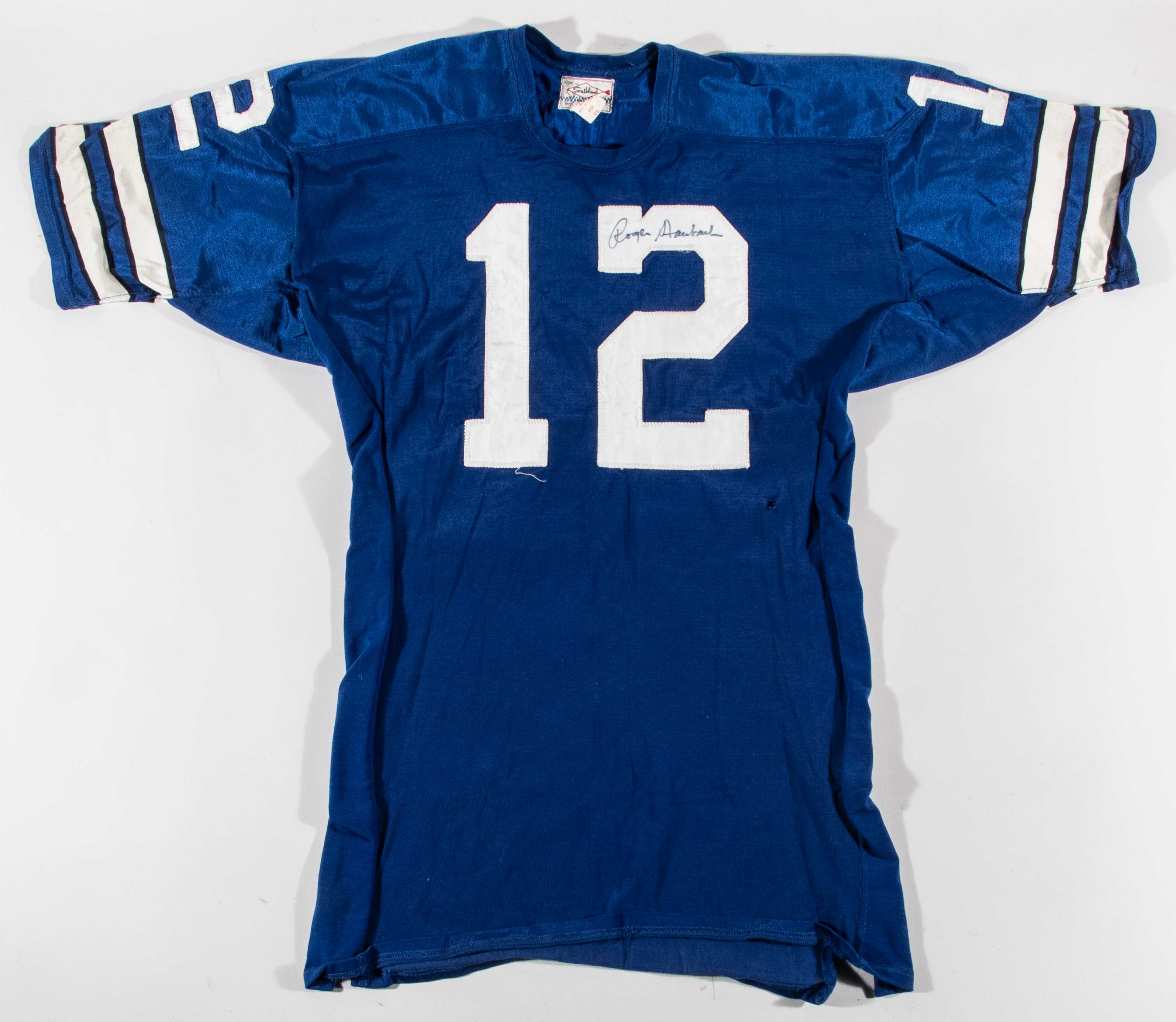 Description:Exceptional Roger Staubach autographed Dallas Cowboys professional model jersey c.1970s (Team repair). Southland size 46 blue road jersey with "STAUBACH" nameplate sewn across the back, along with #12 sewn on the front, back, and shoulders. Southland tag is sewn inside the collar with attached flag tag noting size, wash instructions, and order number. Staubach signed the jersey in blue marker. Signature rates 8 out of 10. Superior use including a 3" team repair on the back, and a small hole on the front. Includes LOA from Hunt Auctions (jersey) and JSA auction LOA (autograph): EX