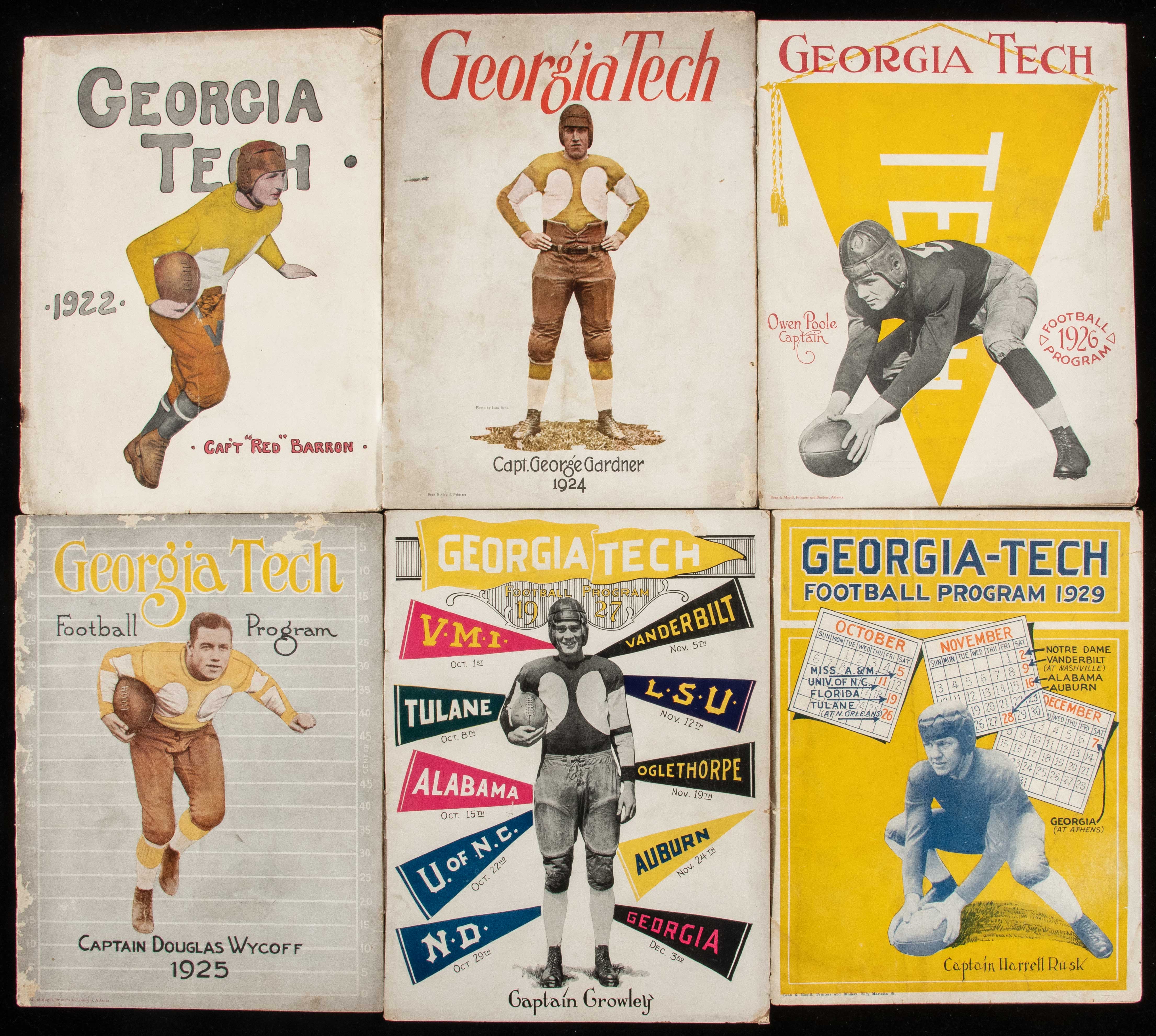 Description:Lot of (6) 1922-1929 Georgia Tech football game programs. Includes 1922 vs. Auburn (FR/GD-GD); 1924 vs. Vanderbilt (FR/GD-GD); 1925 (opponent unclear) (FR); 1926 vs. Auburn (GD); 1927 vs. Auburn (GD-GD/Vg); and 1929 (opponent unclear) (PR/FR). Varying degrees/types of wear throughout: PR-GD
