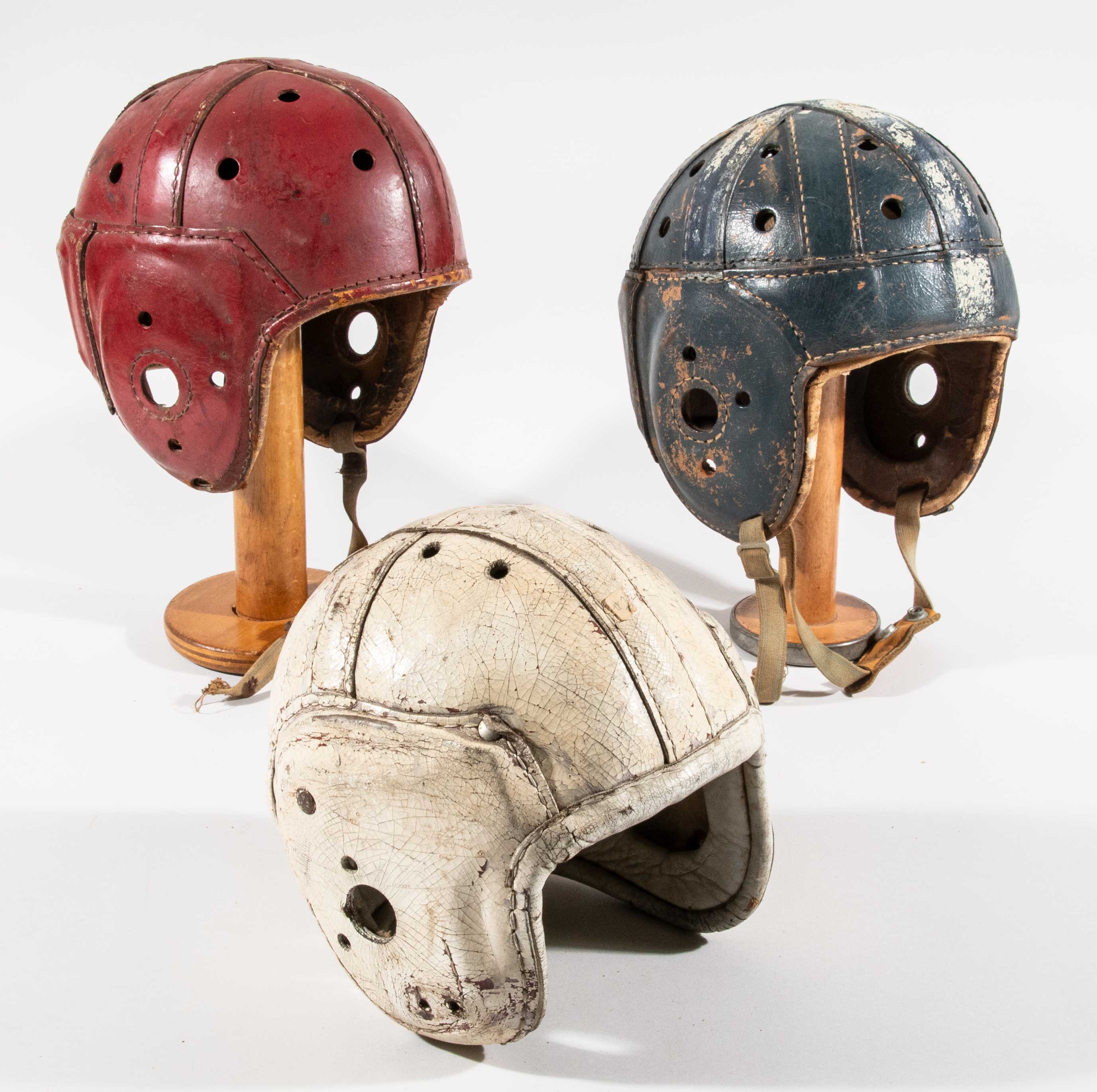 Description:Lot of (3) c.1940s-50s football helmets. Trio of helmets, two of which were each painted in the period, prior to use, presumably to reflect the primary color of the associated team, and the last appears to have possibly been done in red and the time of manufacture. Two were made by Rawlings, the last has no visible mark. Use/wear evident throughout: VG-EX