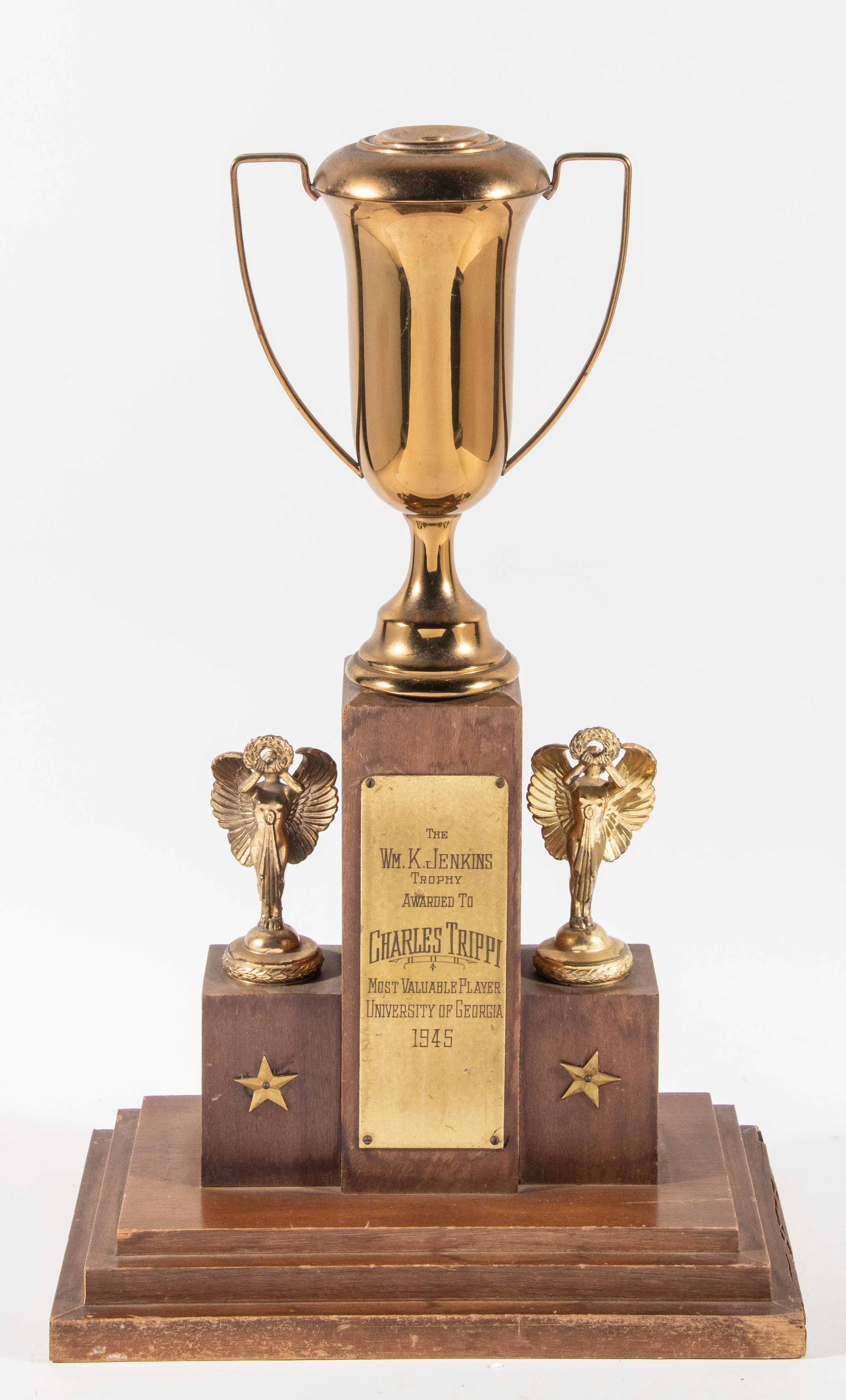 Description:1945 Charley Trippi "Most Valuable Player, University of Georgia" trophy. Large presentational trophy awarded to Charlie Trippi for his efforts during the Georgia Bulldogs 1945 season. The following year he would piece together one of the most celebrated collegiate football seasons of the decade and then embark on a Hall of Fame caliber professional career. The piece stands just over 20" tall with a handled trophy cup atop wooden plinth with a descriptive placard affixed to the front. Text reads, "The Wm. K. Jenkins Trophy Awarded To Charles Trippi, Most Valuable Player, University of Georgia, 1945." A pair of winged figurals decorate either side. Base measures 12.5"x7.75". Scattered surface wear with some chipping/cracking to right edge. Mild tarnish. It is possible/likely that an additional piece is missing from the top: VG