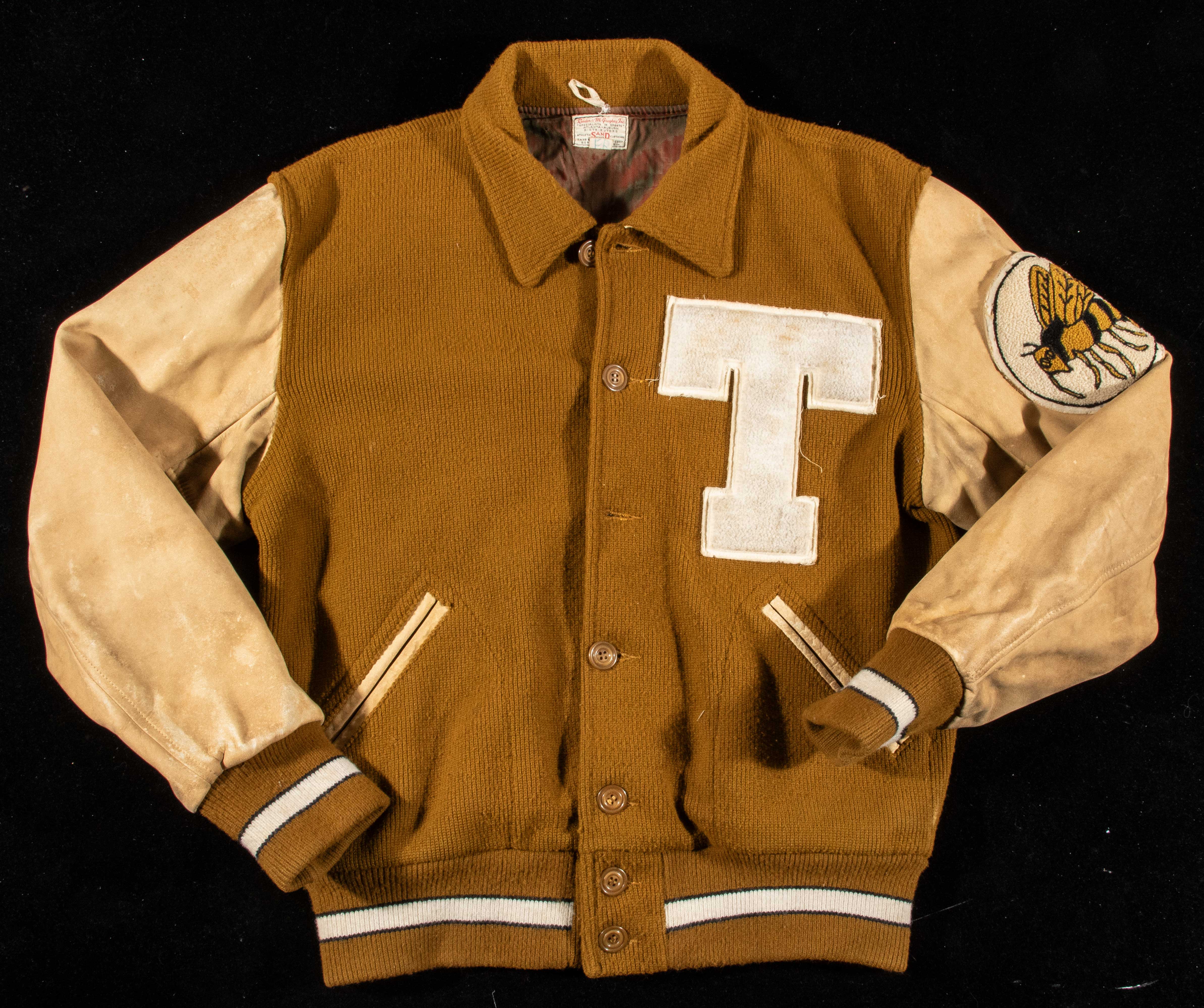 Description:Georgia Tech Yellowjackets letterman's' jacket c.1950s-60s. Early style making for an ideal display piece related to this historic school. Heavy woolen body has a "T" logo patch on the front chest and a mascot logo applied to the sleeve. Sand-Knit tag in the collar has adjacent size (42) flag tag. Use and general age related wear are evident throughout. Includes LOA from Hunt Auctions: VG-EX