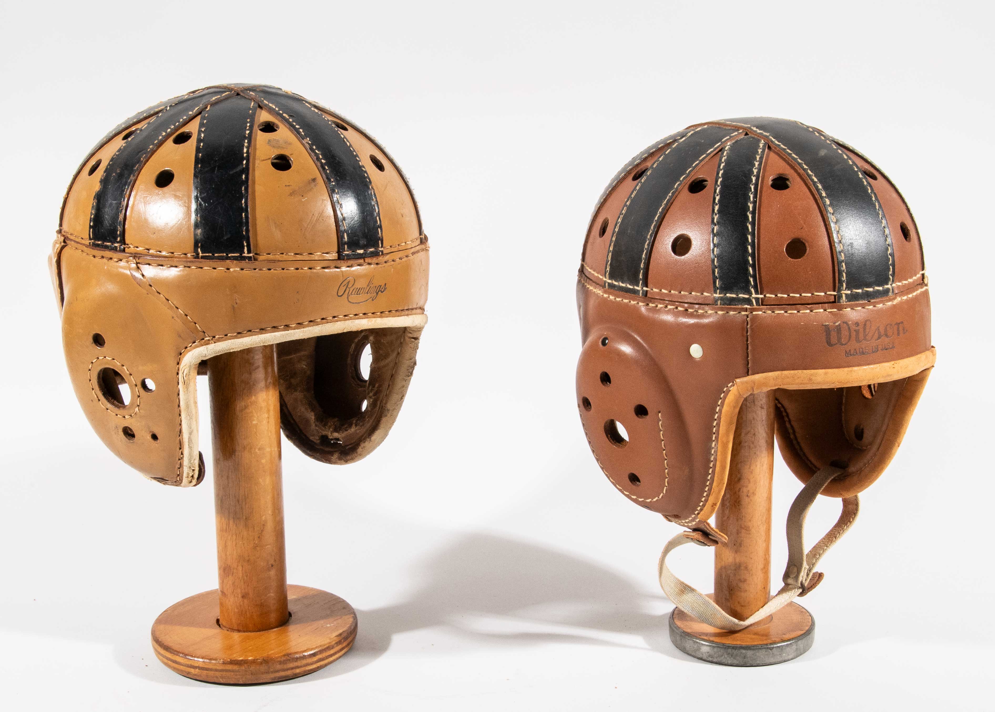 Description:Very sharp Rawlings and Wilson football helmets c.1950s-60s. Nice pair in strong condition with bold and well defined markings. The Wilson example is "new old stock" with just a touch of light age/storage wear. Rawlings shows modest use/wear (including scuffs/scrapes - chin strap missing) and has a partial "30" player number decal on back: VG/EX and EX/MT-NM