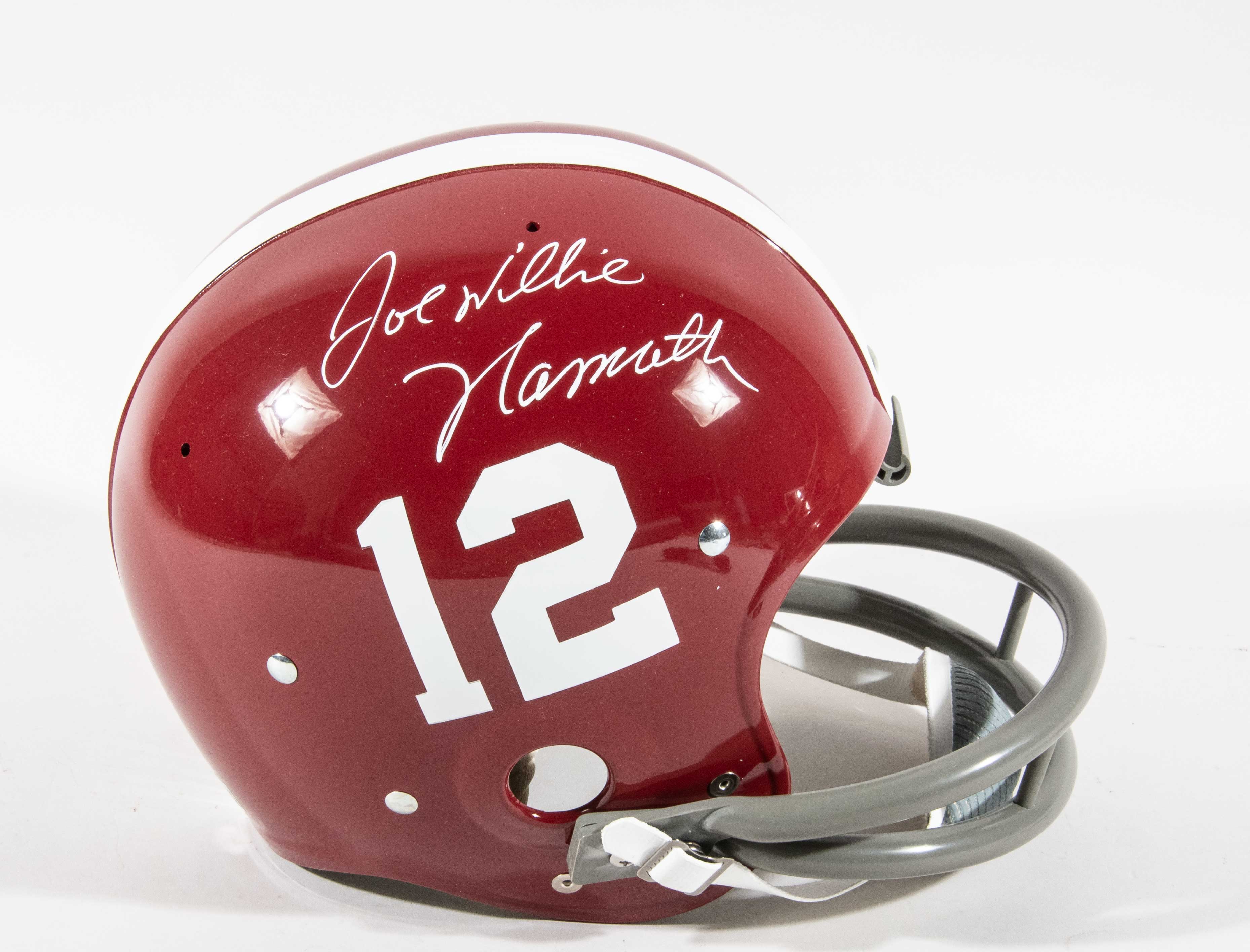 Description:Joe Namath autographed University of Alabama throwback helmet. Throwback helmet with two-bar facemask has number "12" decals on either side. Signed "Joe Willie Namath" in marker rating 8/9 out of 10. Beckett authentication sticker affixed: NM