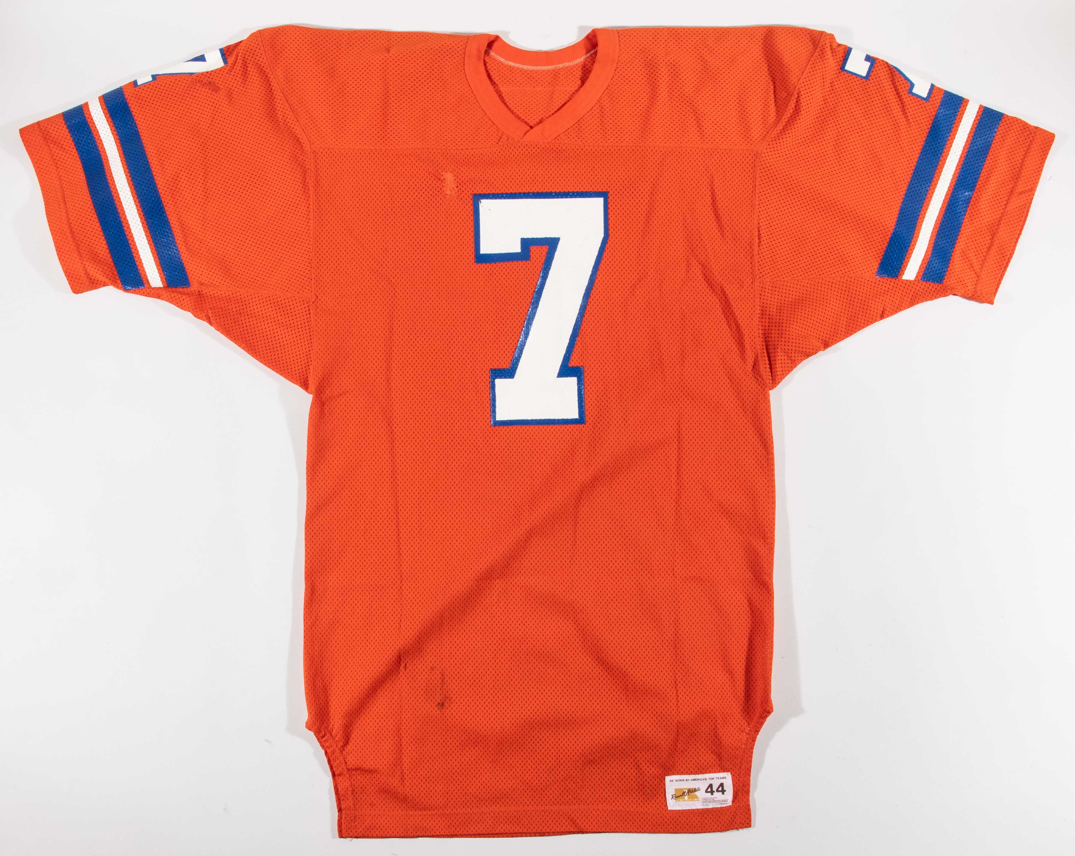 Description:Craig Morton professional model Denver Broncos jersey c.1981-82 (team repairs). Russell Athletic size 44 orange home jersey with "MORTON" nameplate sewn across the back, along with #7 on the front, back, and sleeves, and Rissell Athletic tag sewn on the front tail. Excellent use with scattered stains and team repairs on the chest and right sleeve. Includes LOA from Hunt Auctions: EX