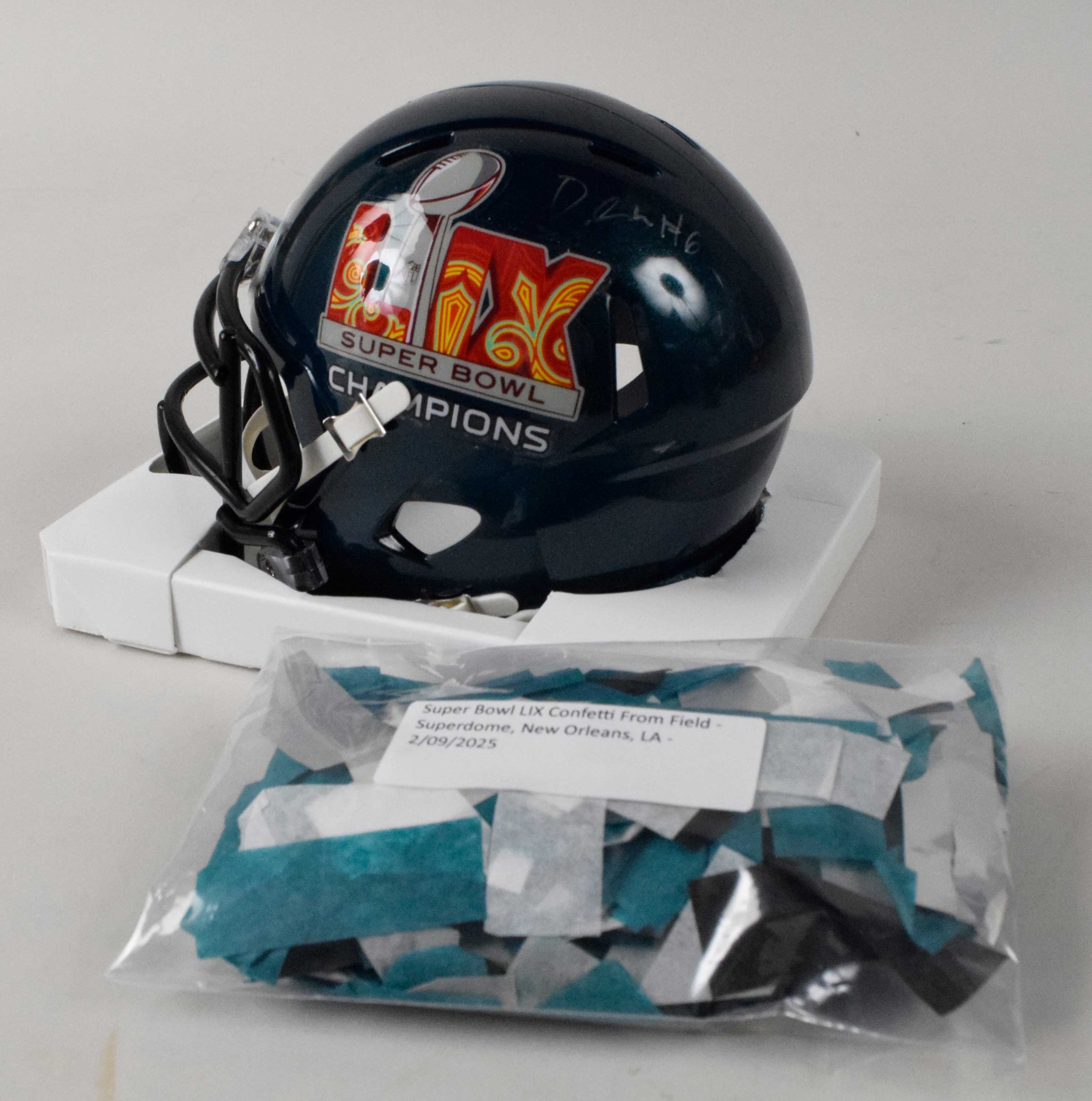 Description:DeVonta Smith autographed Super Bowl LIX Champions mini helmet with on-field celebration confetti. Smith signed the helmet in silver marker. Signature rates 8/9 out of 10. Includes approx. 3.5"x6" bag of Philadelphia Eagles celebration confetti from the Superdome field, and NFL Auction COA from PSA (matching serial #ed sticker on the helmet): NM