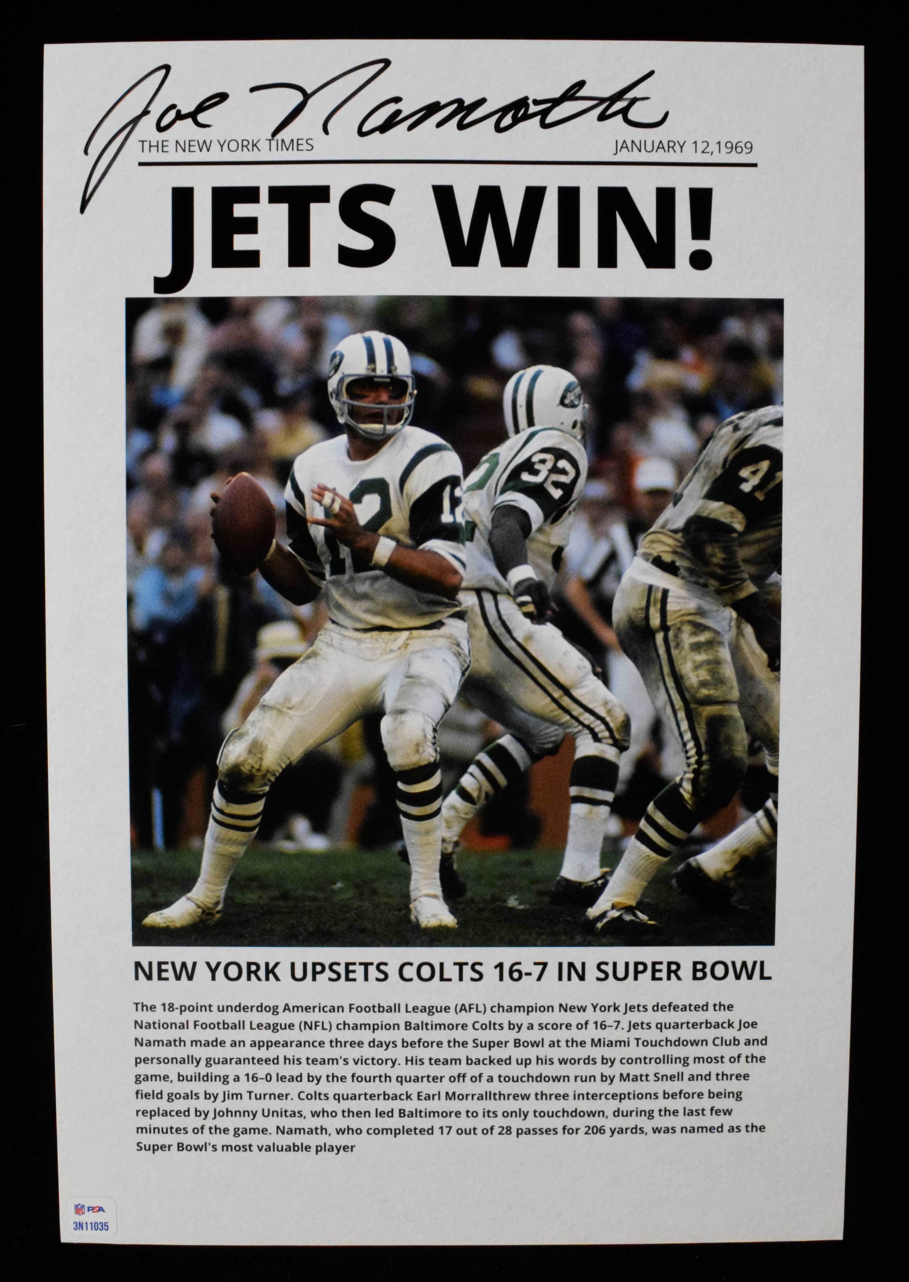 Joe Namath autographed 12"x18" poster. "JETS WIN!" poster signed by Namath in black marker. Signature rates 9/10 out of 10. Includes NFL Auction COA from PSA, with matching serial #ed sticker on the poster: NM