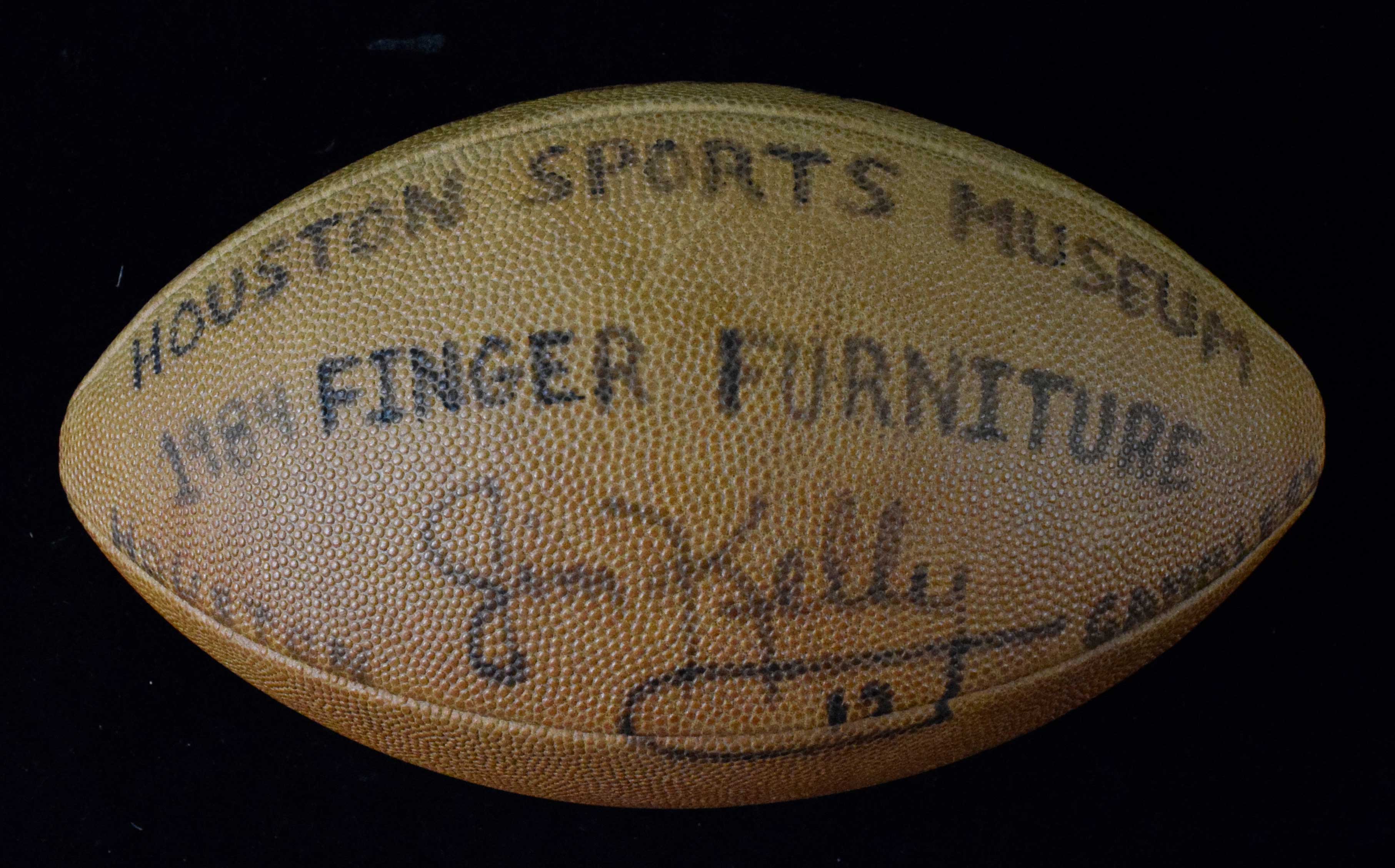 Description:Jim Kelly autographed 1984 USFL football displayed at the Houston Sports Museum. Wilson official USFL ball signed by Kelly in black marker. Signature rates 7 out of 10. "Houston Sports Museum" "1984 Finger Furniture" (the Finger family owned the collection), and "Houston Gamblers" notations are written around Kelly's autograph. Minimal wear, but fading to the original brown surface. Includes COA from JSA, with matching serial #ed sticker on the ball: EX