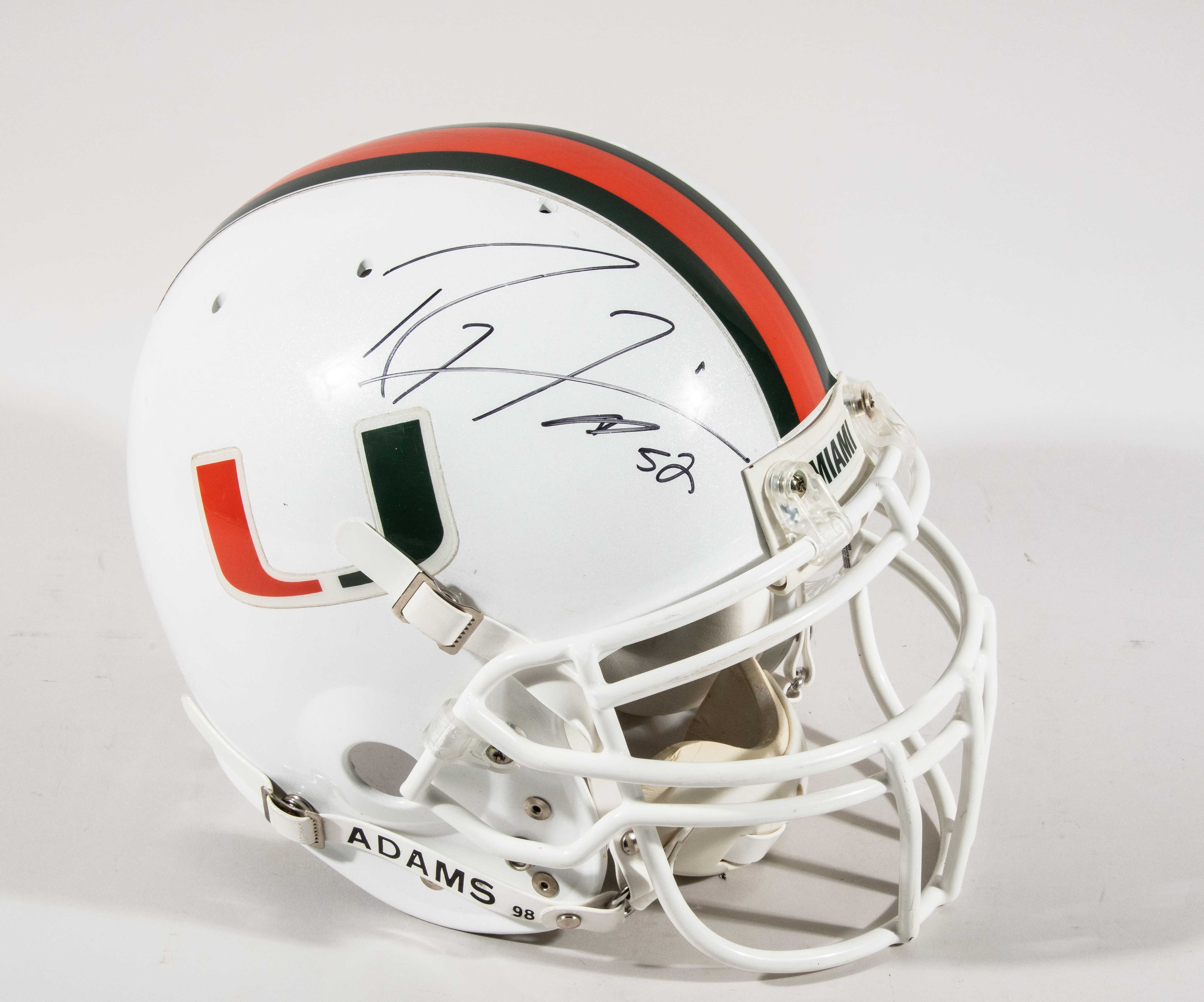 Description:Ray Lewis autographed Miami Hurricanes full size Pro Line helmet. PVM on-field Miami helmet signed by Lewis in black marker. Signature rates 7/8 out of 10. "103" is written inside, and there are scattered scuff marks on the crown, but no evidence to tie the helmet to a specific player. Includes COA from PSA, with matching serial #ed sticker on the helmet: EX