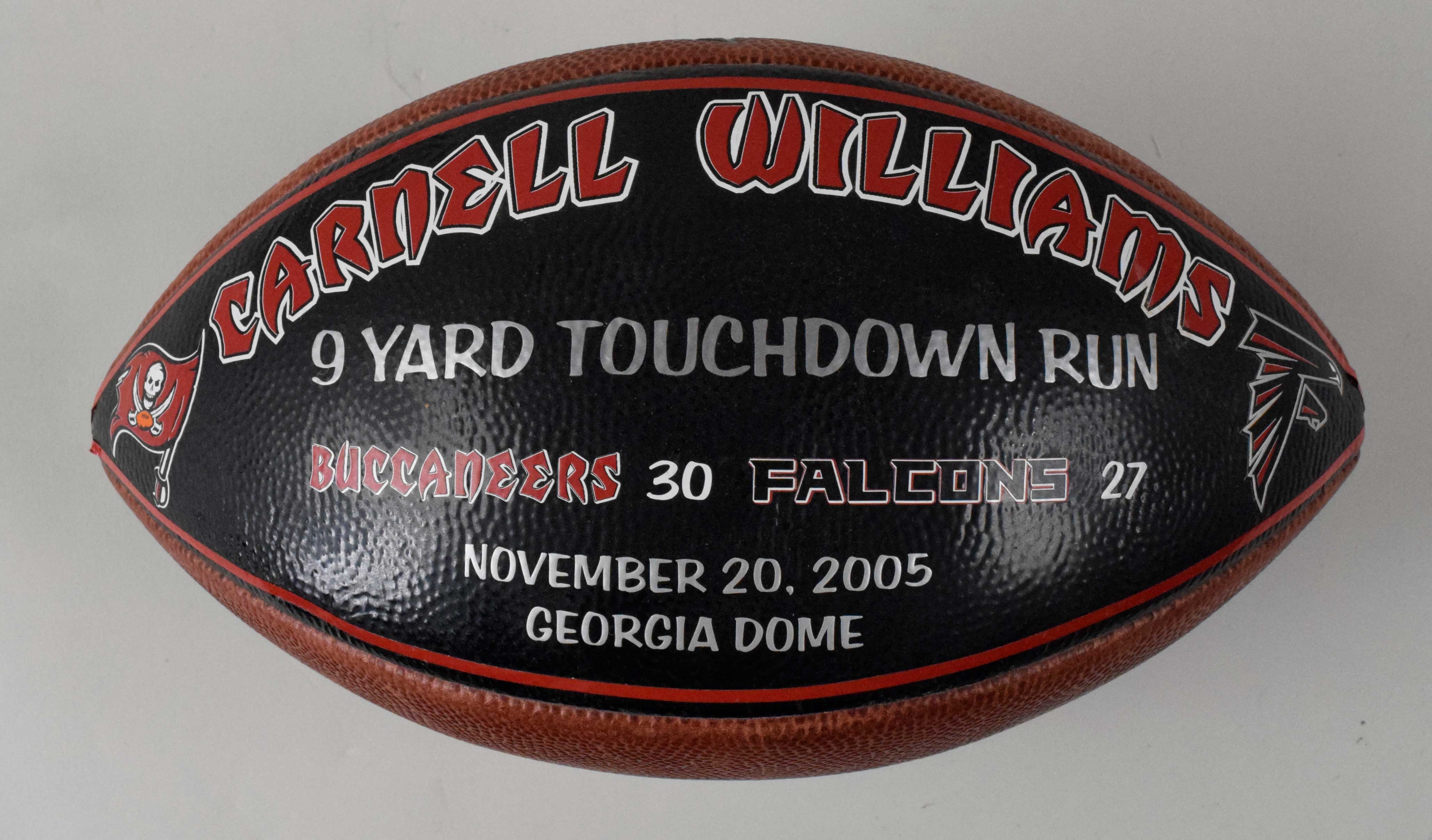 Description:2005 Tampa Bay Buccaneers game ball presented to Cadillac Williams. Wilson official NFL football painted "CARNELL WILLIAMS" "9 Yard Touchdown Run" "Buccaneers 30" "Falcons 27" "November 20, 2005" "Georgia Dome" (a very faded Williams autograph is on the panel above). Not quite fully inflated: EX/MT