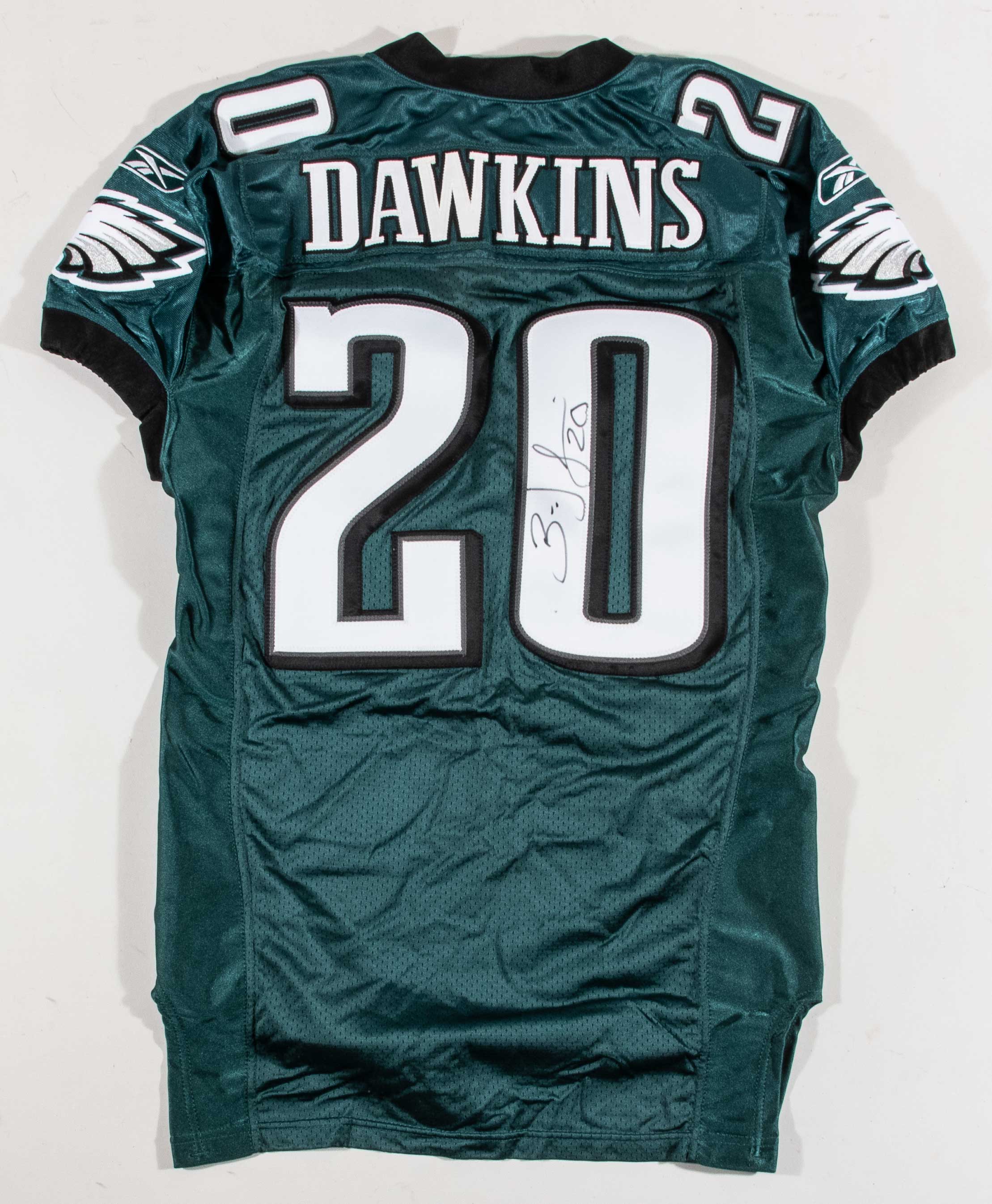 Description:Brian Dawkins autographed 2006 Philadelphia Eagles professional model jersey. Reebok NFL Equipment size 48 midnight green jersey with "DAWKINS" nameplate sewn across the back, along with #20 sewn on the front, back, and shoulders. "06-48" "L" strip tag is sewn inside the collar, NFL patch is sewn on the front collar above "EAGLES" patch, and Reebok tagging is on the front tail with size 48 flag tag attached. Dawkins signed the jersey in black marker. Signature rates 8 out of 10. Appears only lightly worn, if at all. Includes LOA from Hunt Auctions (jersey) and JSA auction LOA (autograph): EX/MT