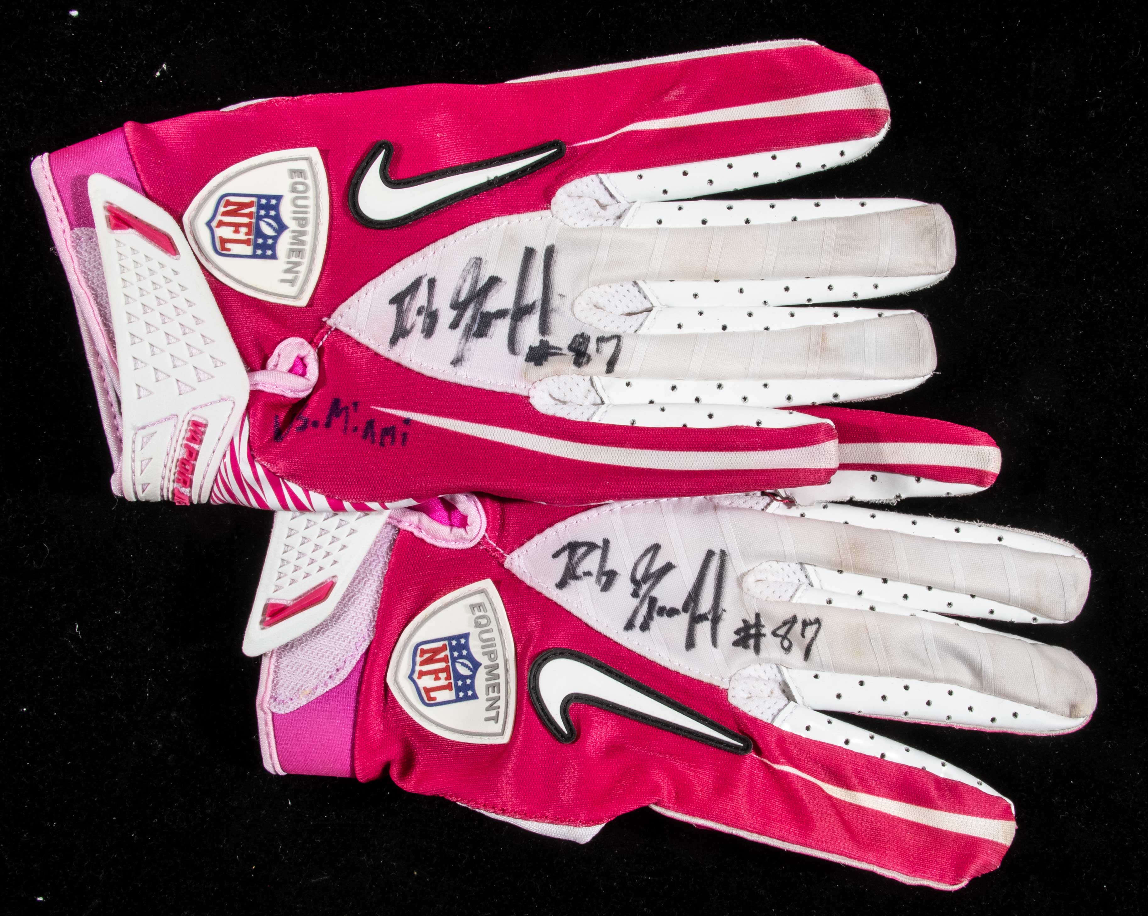 Description:Rob Gronkowski autographed 2010 rookie year professional model cancer awareness game gloves. Nike NFL Equipment size 3XL pink gloves with #87 written on both interior tags, and "vs. Miami" written on the right glove. Gronkowski signed both gloves in black marker. Signatures rate 7 to 8 out of 10. Gronkowski had a 4-yard reception in the game. Includes LOA from Hunt Auctions (gloves) and JSA auction LOA (autographs): EX