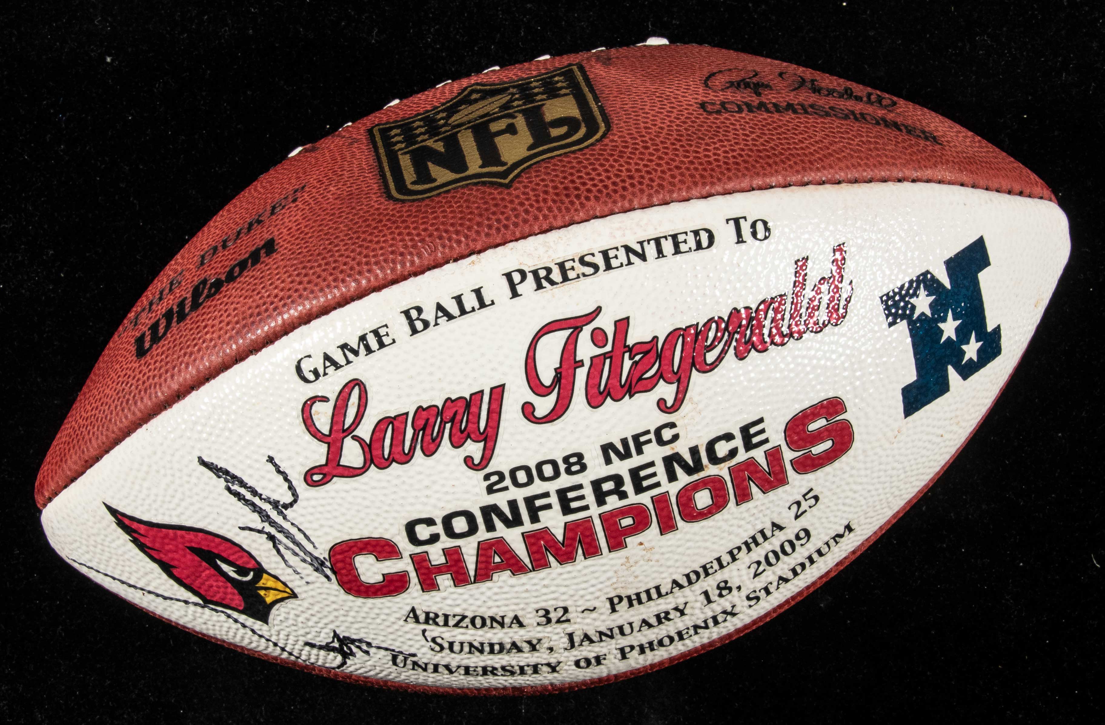 Description:Arizona Cardinals 2008 Conference Champions game ball presented to Larry Fitzgerald. Wilson official NFL football painted "Game Ball Presented To Larry Fitzgerald" "2008 NFC Conference Champions" "Arizona 32 - Philadelphia 25" "Sunday, January 18, 2009" "University Of Phoenix Stadium" (Fitzgerald had 9-receptions for 152-yards and 3-TDs in the game). There are some markings/signatures on the ball possibly of equipment manager or person painting the ball: EX/MT