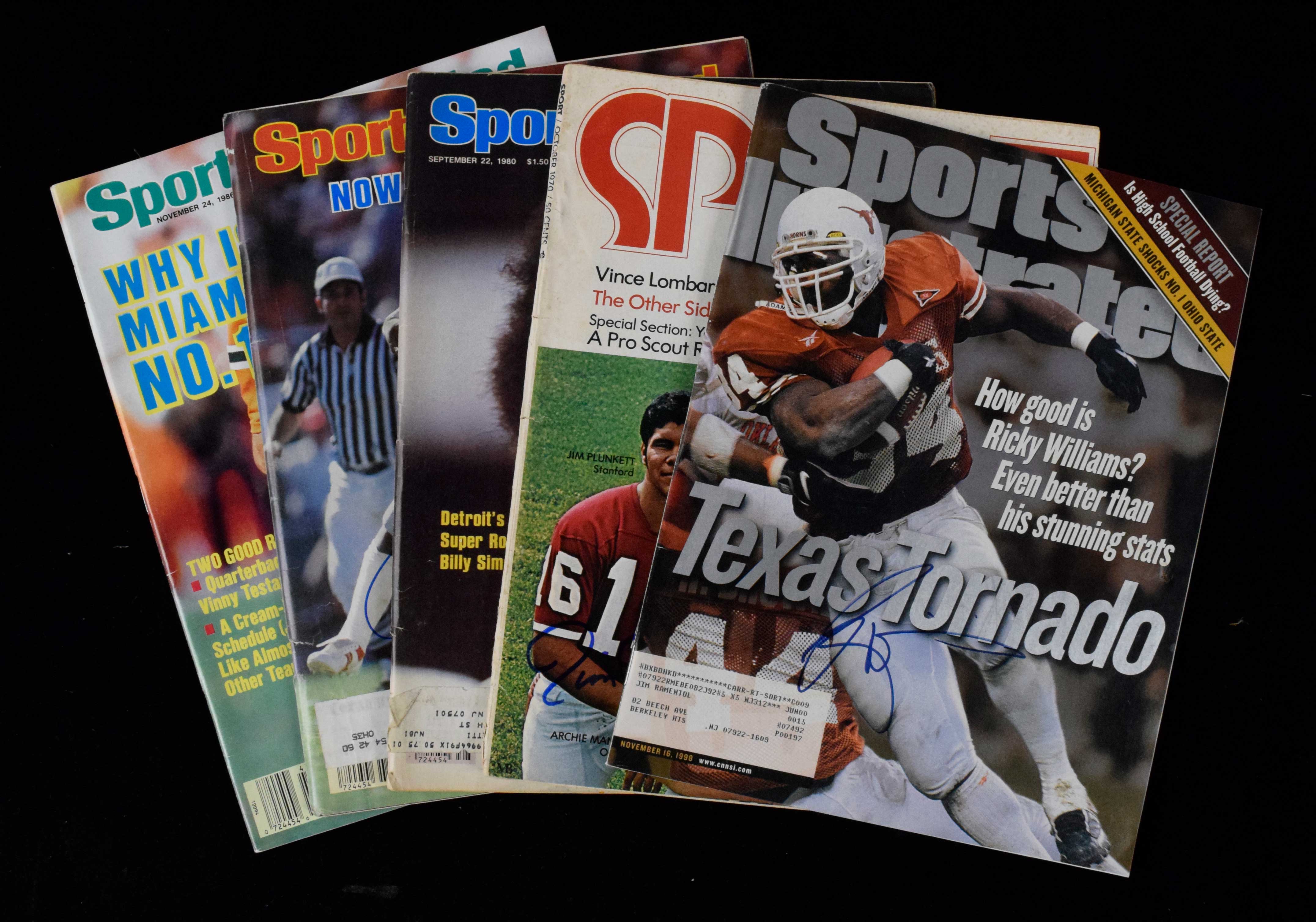 Description:Lot of (10) Heisman Trophy Winner autographed publications and/or covers. Includes issues of Sports Illustrated signed by Jim Plunkett (also signed by Archie Manning), Ricky Williams, Billy Simms, Herschel Walker, and Vinny Testaverde; Sporting News covers (in some cases a complete issue, others may have missing pages, and some are only the cover) signed by Marcus Allen, Mike Rozier, Tony Dorsett, Gary Beban, and Charlie Ward. Marker signatures rate 8 out of 10 or better. There are varying degrees/types of mostly light handling and age related wear which more notably effect the Sporting News pieces. Some have mailing labels. Includes auction LOA from JSA: Sigs. NM, Publications VG-EX/MT